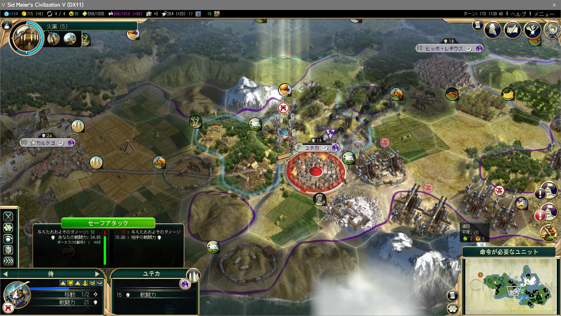 都市:ユチカを占領。炎上させよっかなーと思ったら、パルテノン神殿があるじゃないか。うーん………じゃ傀儡で。世界議会で文化的遺産が通る予定だし、無駄にはならないだろ。