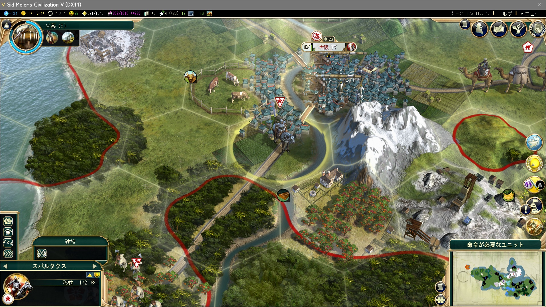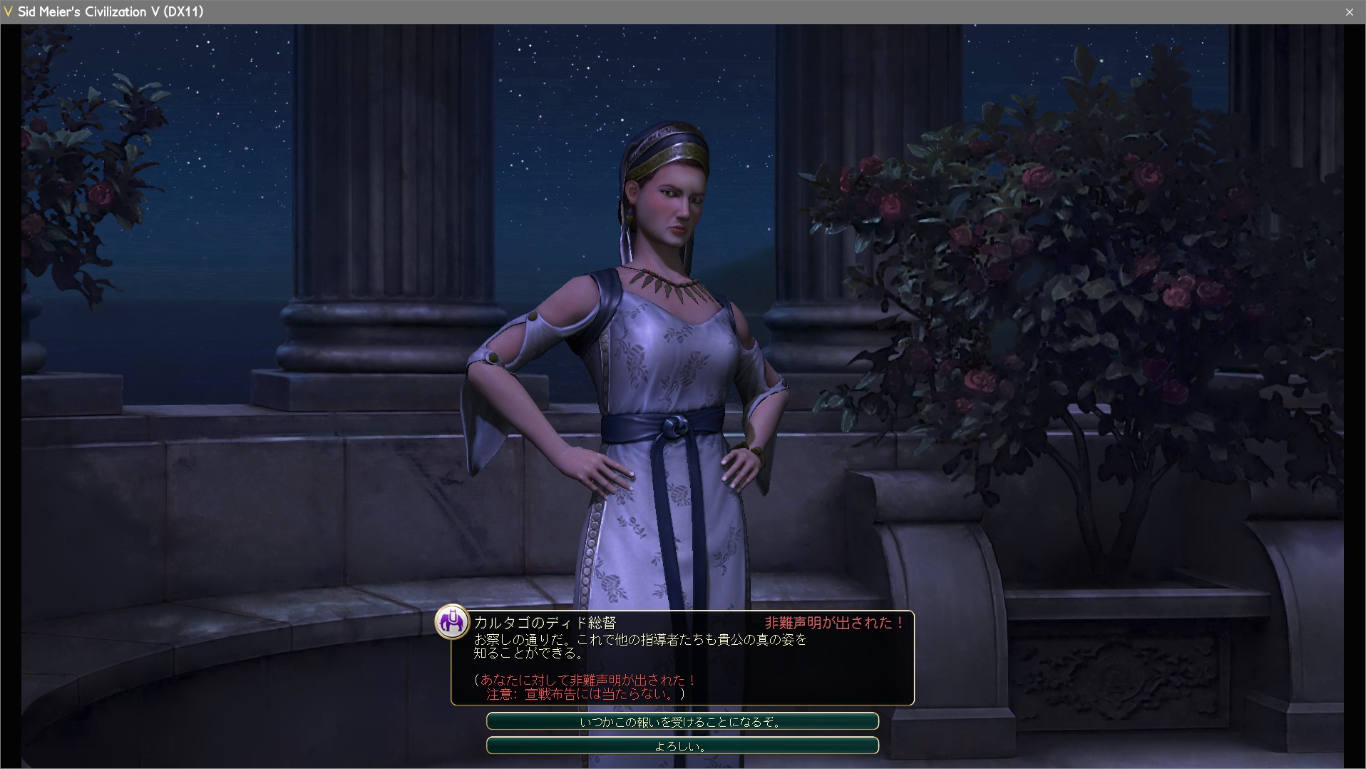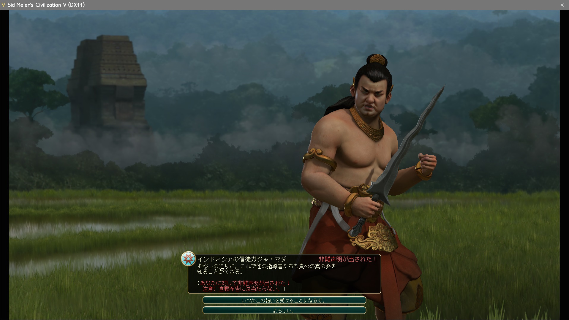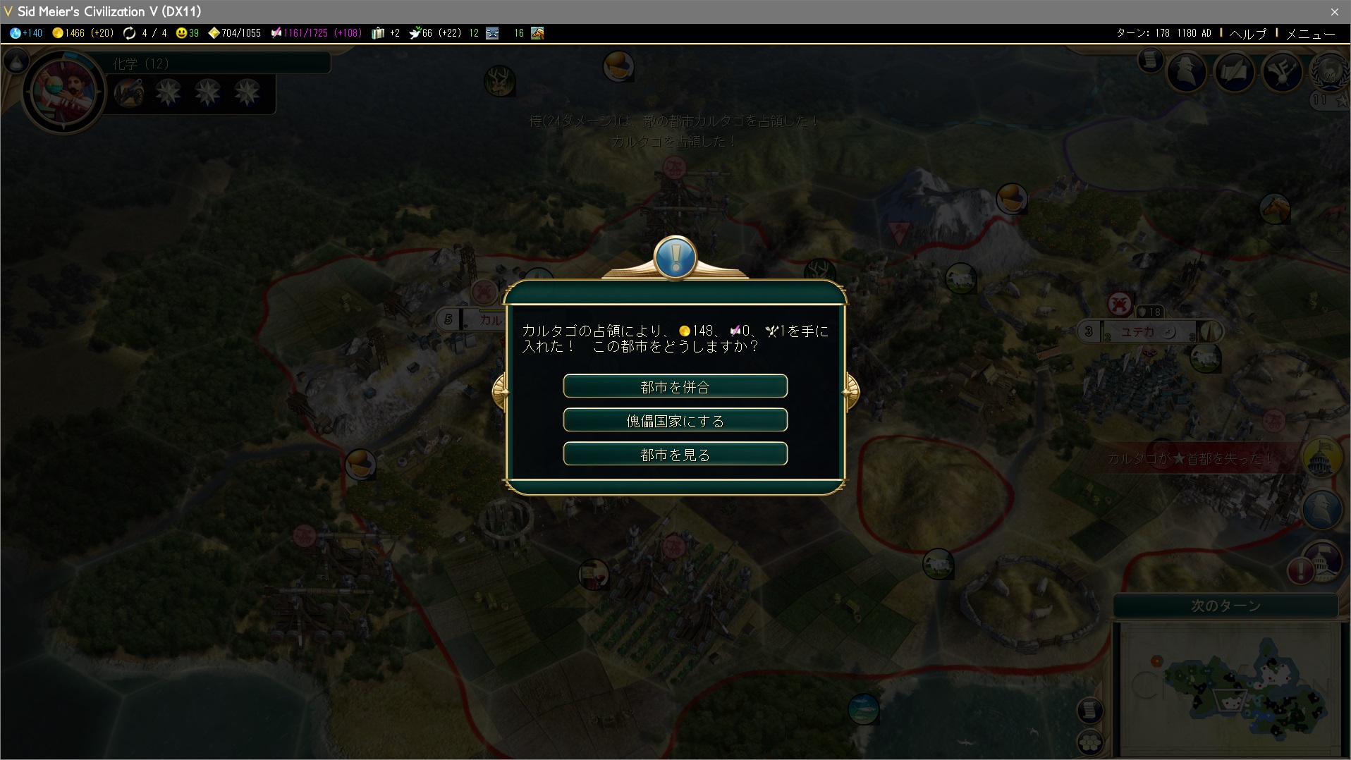 3つの都市を占領したことで好戦性ペナルティが上がって友好国以外の文明に嫌われてしまった。文明を滅亡させると、都市の占領とは比較できない程にとてつもない好戦性ペナルティをくらってしまう。