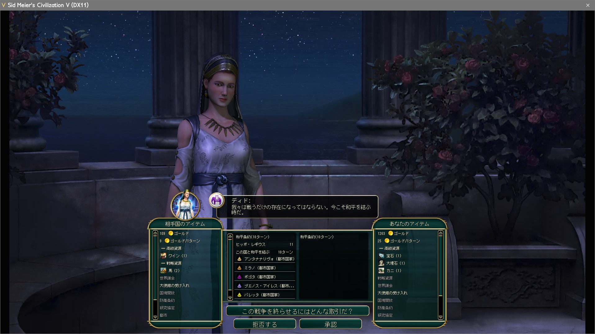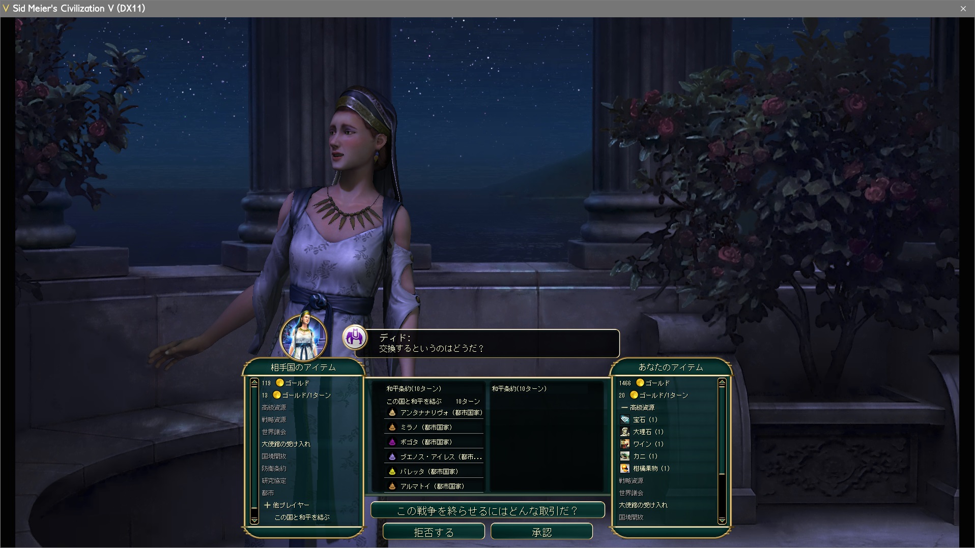 次のターンに首都:カルタゴ陥落といったところで、カルタゴのディドが和平交渉を持ちかけてきた。