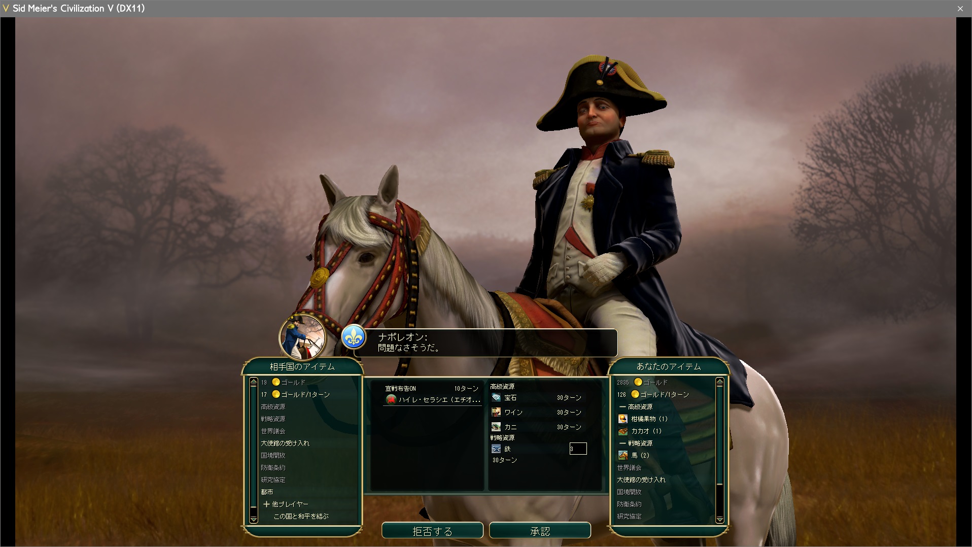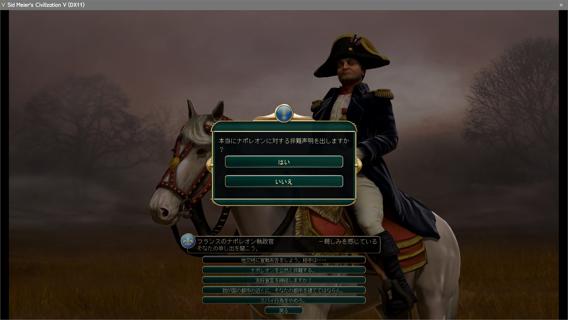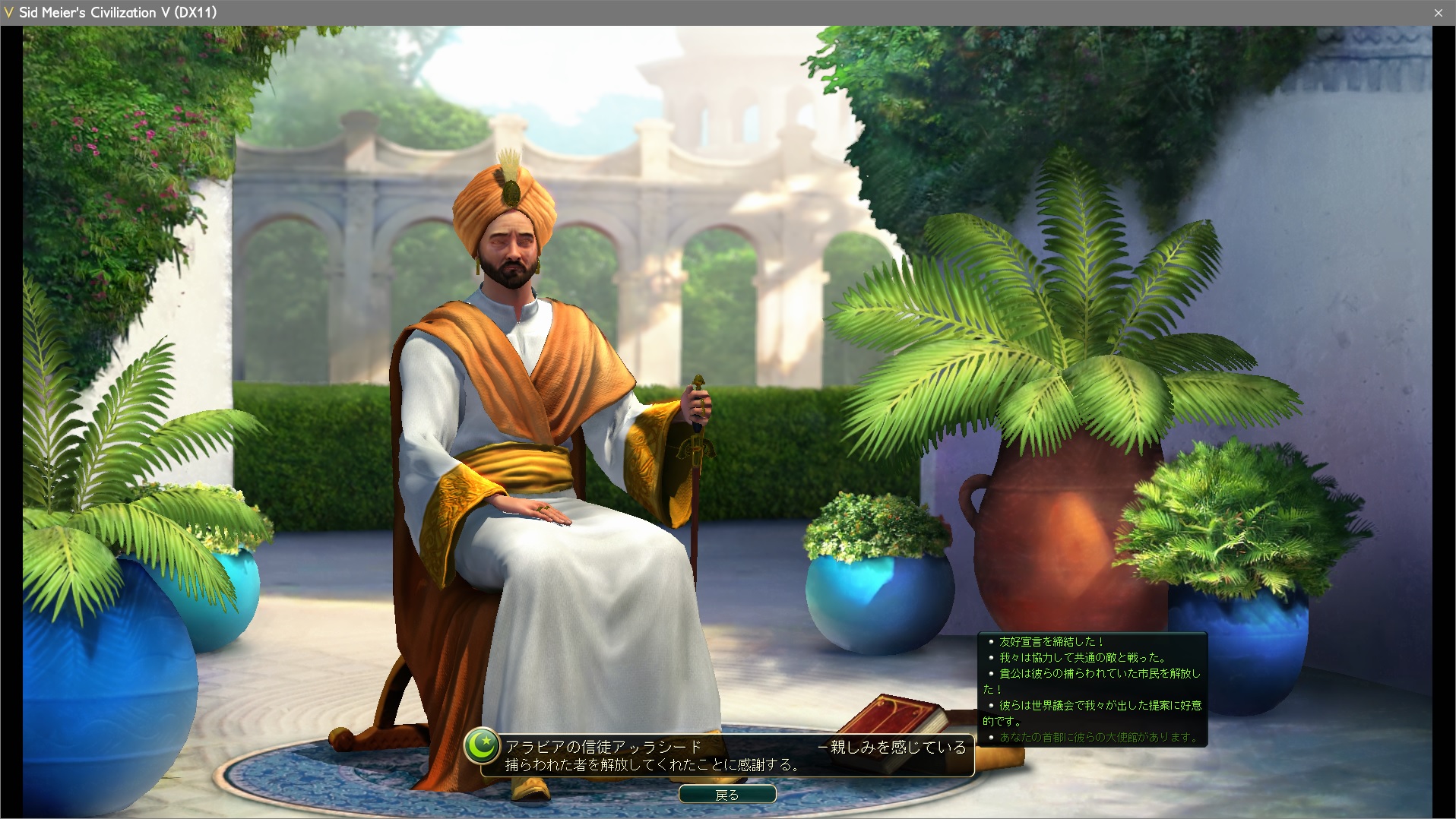 宣戦布告1ターン前に宣戦依頼。なぜ1ターン前なのかというと、ちょうど万国博覧会可決ターンだったからだ。全文明を戦争状態にすることでハンマー投入を防ぐことができるぞ。金賞を取るためには必須のテクニックだから良い子は真似するように。