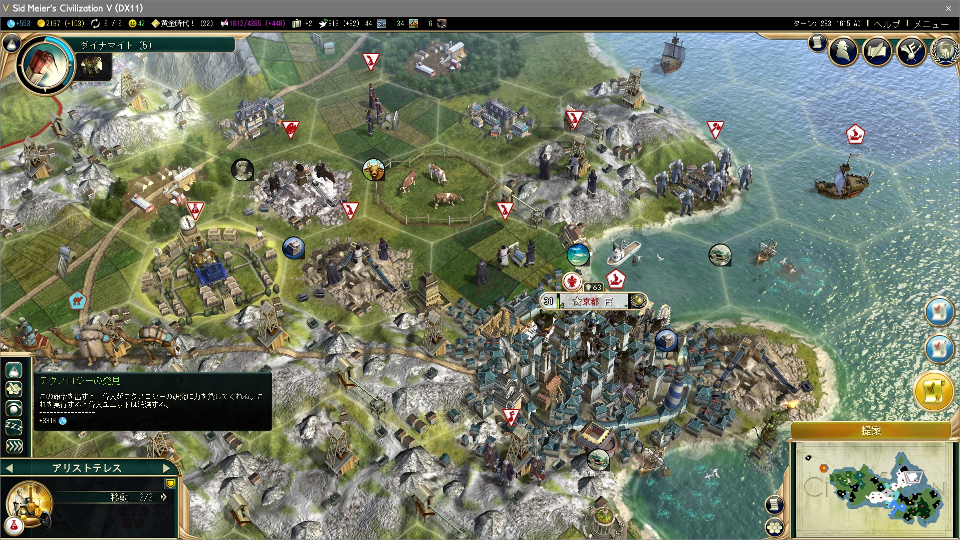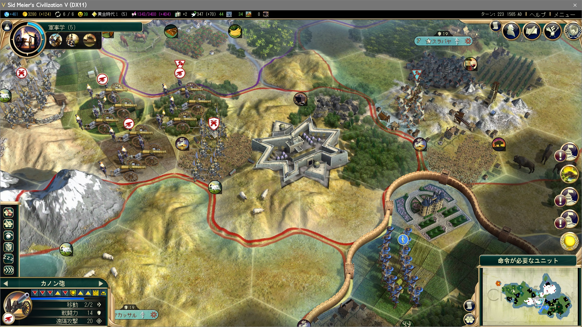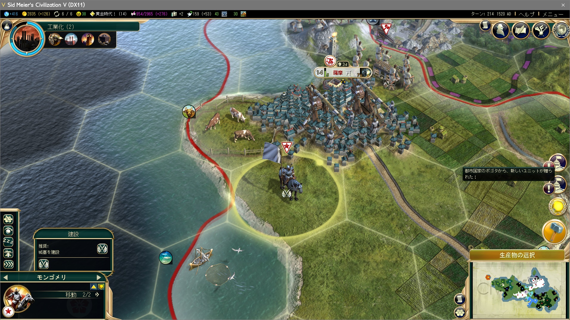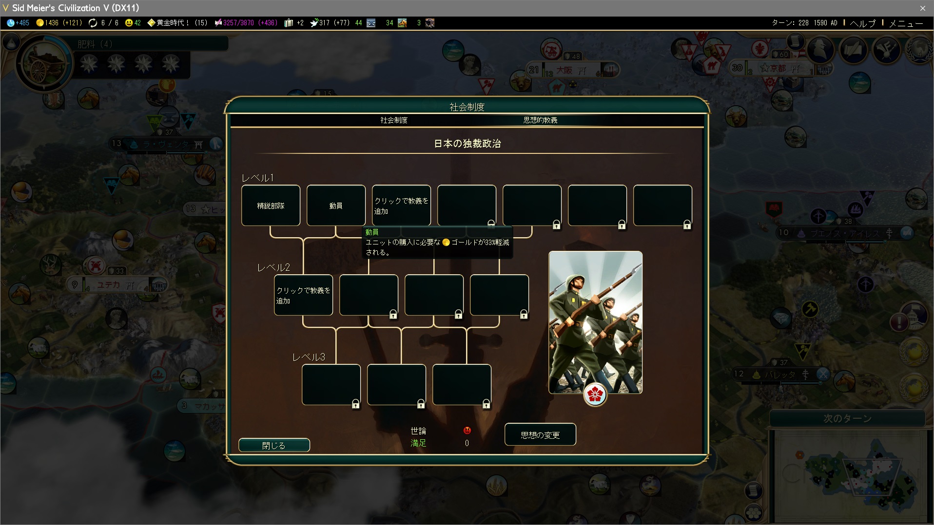 そして2ターン後、レベル2の総力戦を獲得。軍事ユニットの生産+25%、ユニットに経験値+15。総力戦があれば動員はいらないよなぁ…