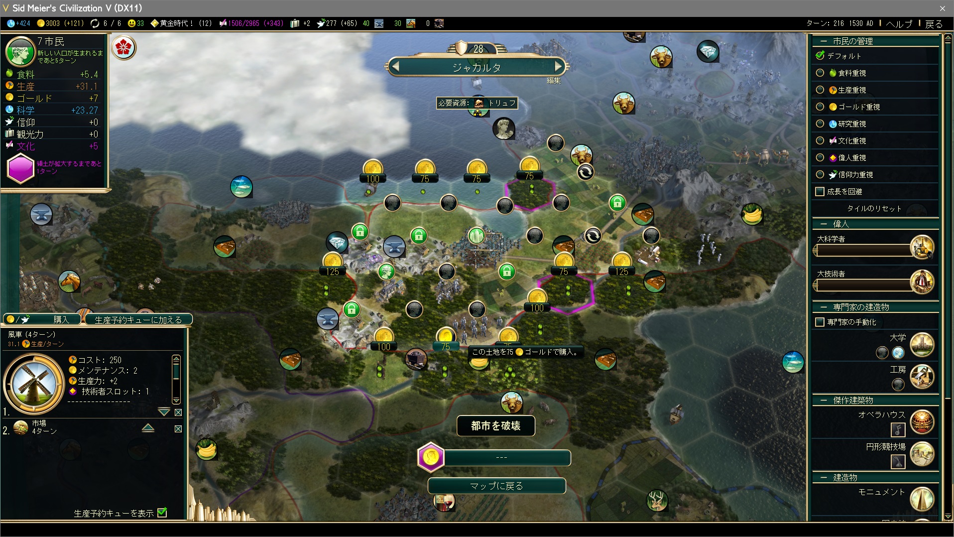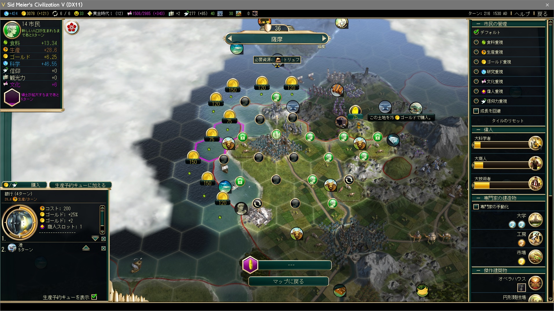 ところが文化圏の外に大量に湧いていた。文化圏の拡大を待たず、タイル購入で確保しよう。万が一他文明の文化圏に奪われてしまわないようにもゴールドの出し惜しみはなしだ。