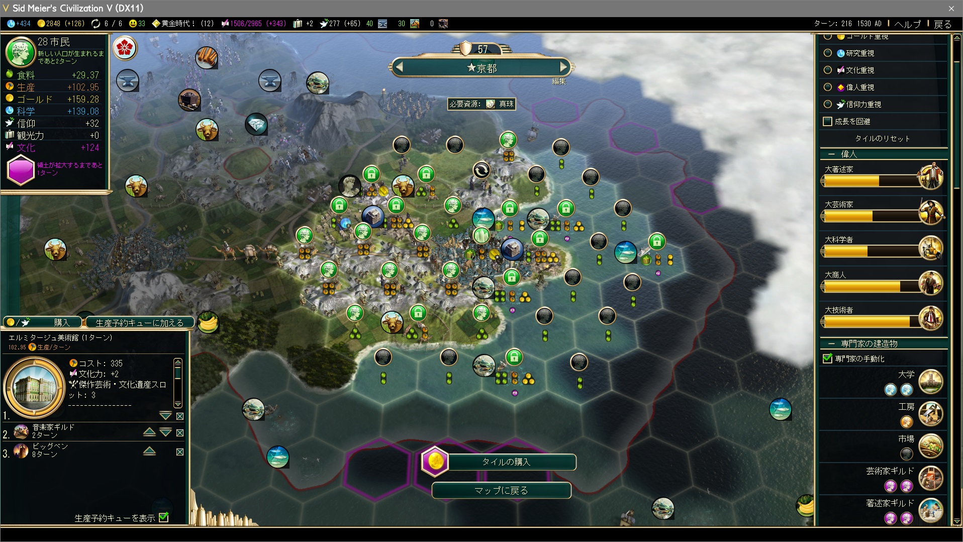 エルミタージュ美術館、黄金期、文化的遺産などで文化力を稼ぎ、大著述家を投入して商業:重商主義を採用。同ターンにビッグベン完成により購入費用40%offだ。
