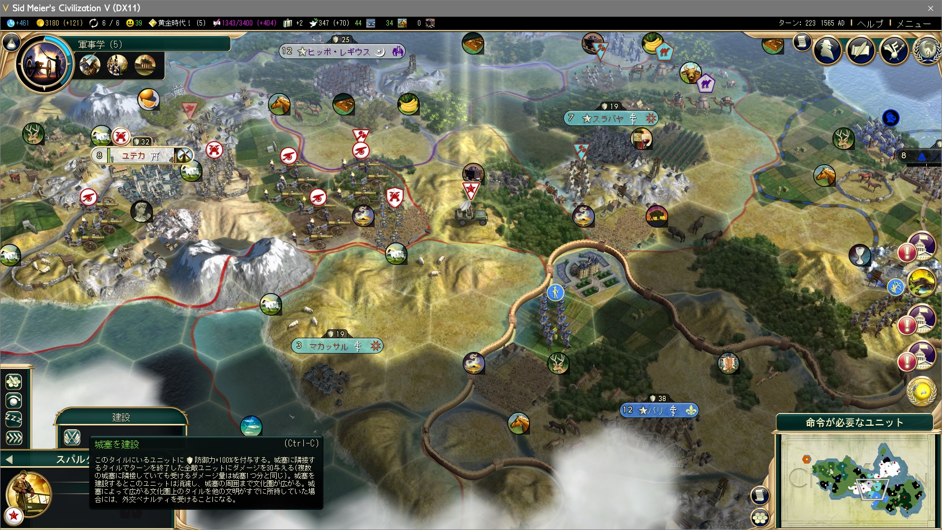 フランスを攻略したいがインドネシアの文化圏がジャマで進軍ルートがない。インドネシアが国境開放に応じてくれないのだ。宣戦布告することで強制国境開放してもいいが、大将軍を消費して城塞を建設することで進軍ルートをこじ開けようと思う。