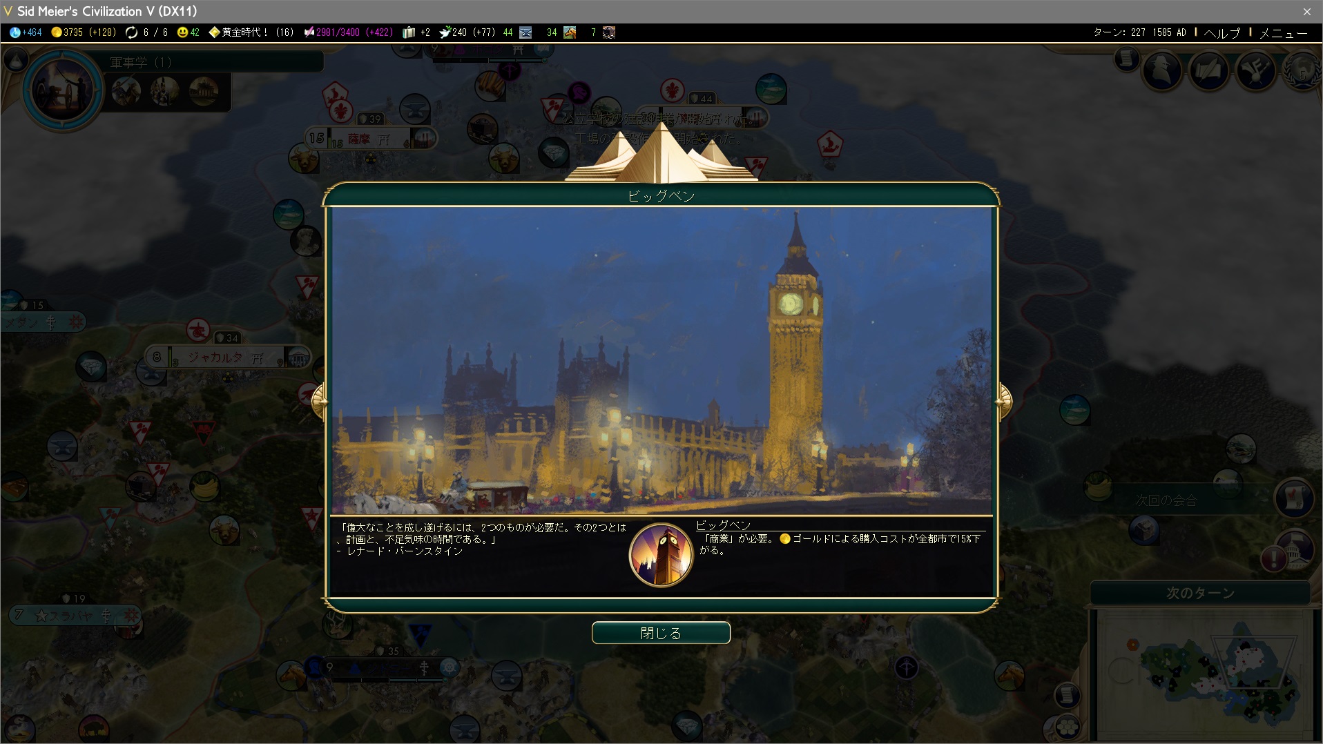 工場を3つ購入して思想の採用が可能に。ビッグベン+重商主義なら工場