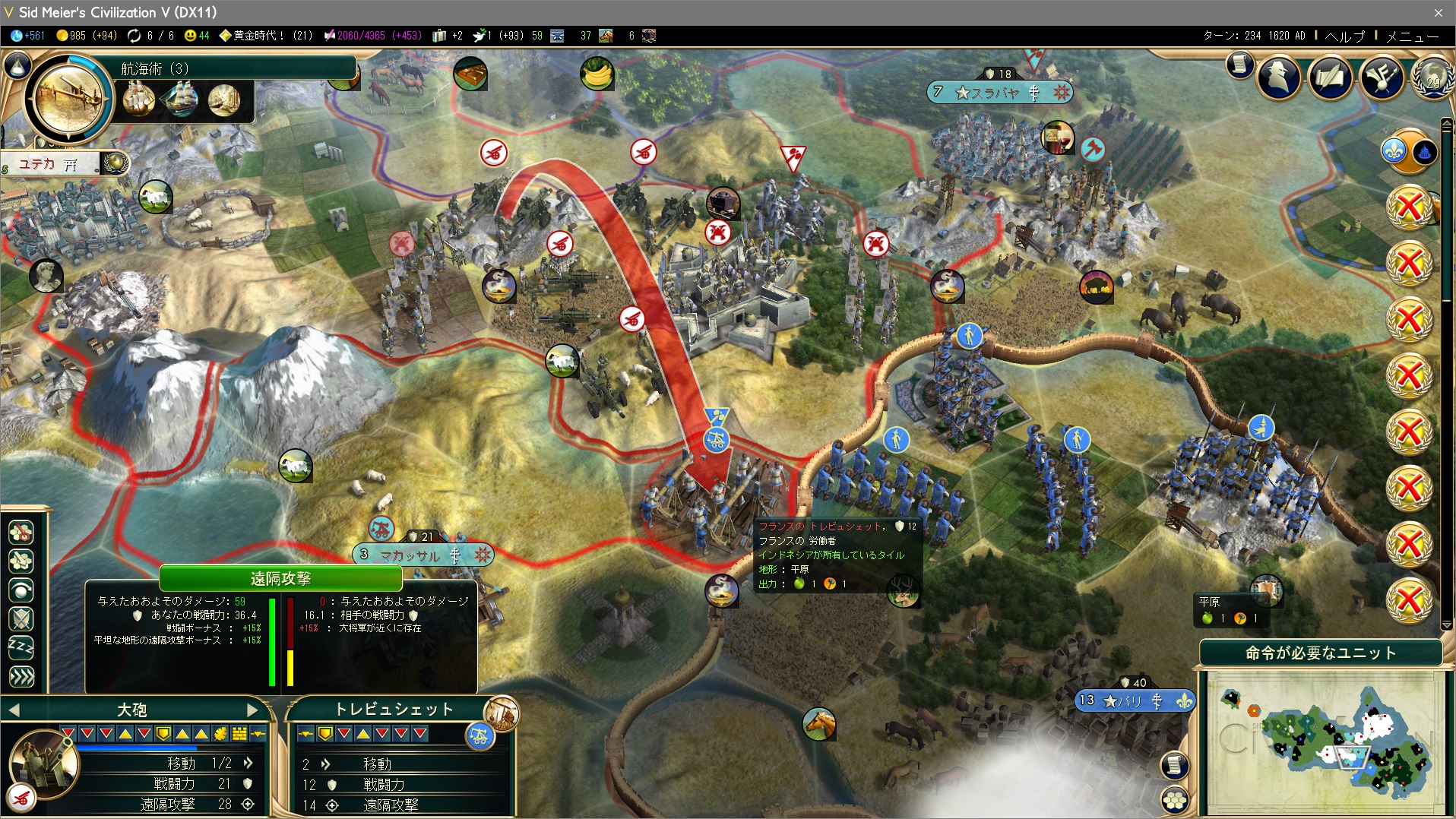 大将軍がインドネシアの文化圏を通って前線に到着。大将軍の周囲2タイル以内のユニットは戦闘力+15%だ。侵攻戦の際は城塞をつくらずに、大将軍の指揮を利用するといい。