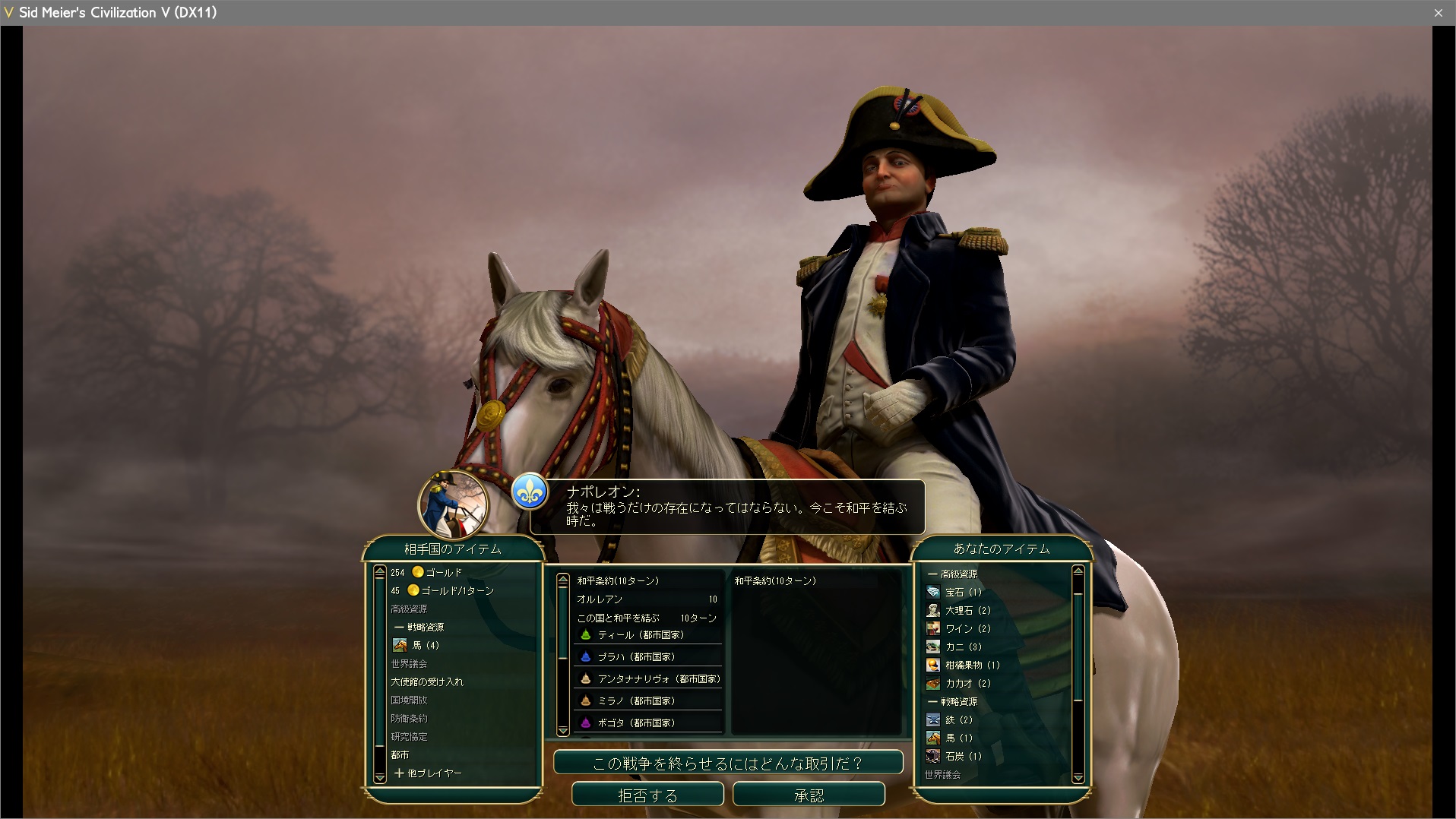 占領の度に必ず確認しよう。1ターン経つだけで和平交渉の内容が有利にも不利にもなる。