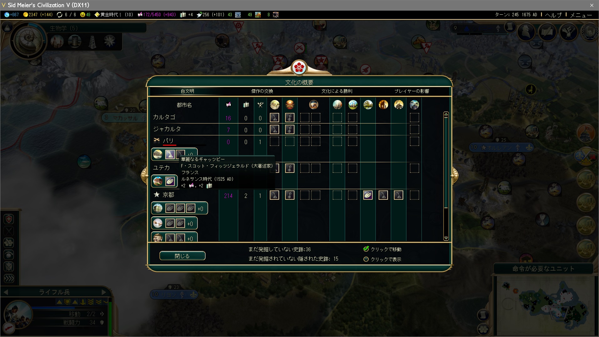 一番忘れやすいのが傑作を移すことかな。反乱中の都市は当然文化・観光を生まない。画面上部の観光ボタンをクリックして[文化の概要]→[自文明]の傑作画面へ。