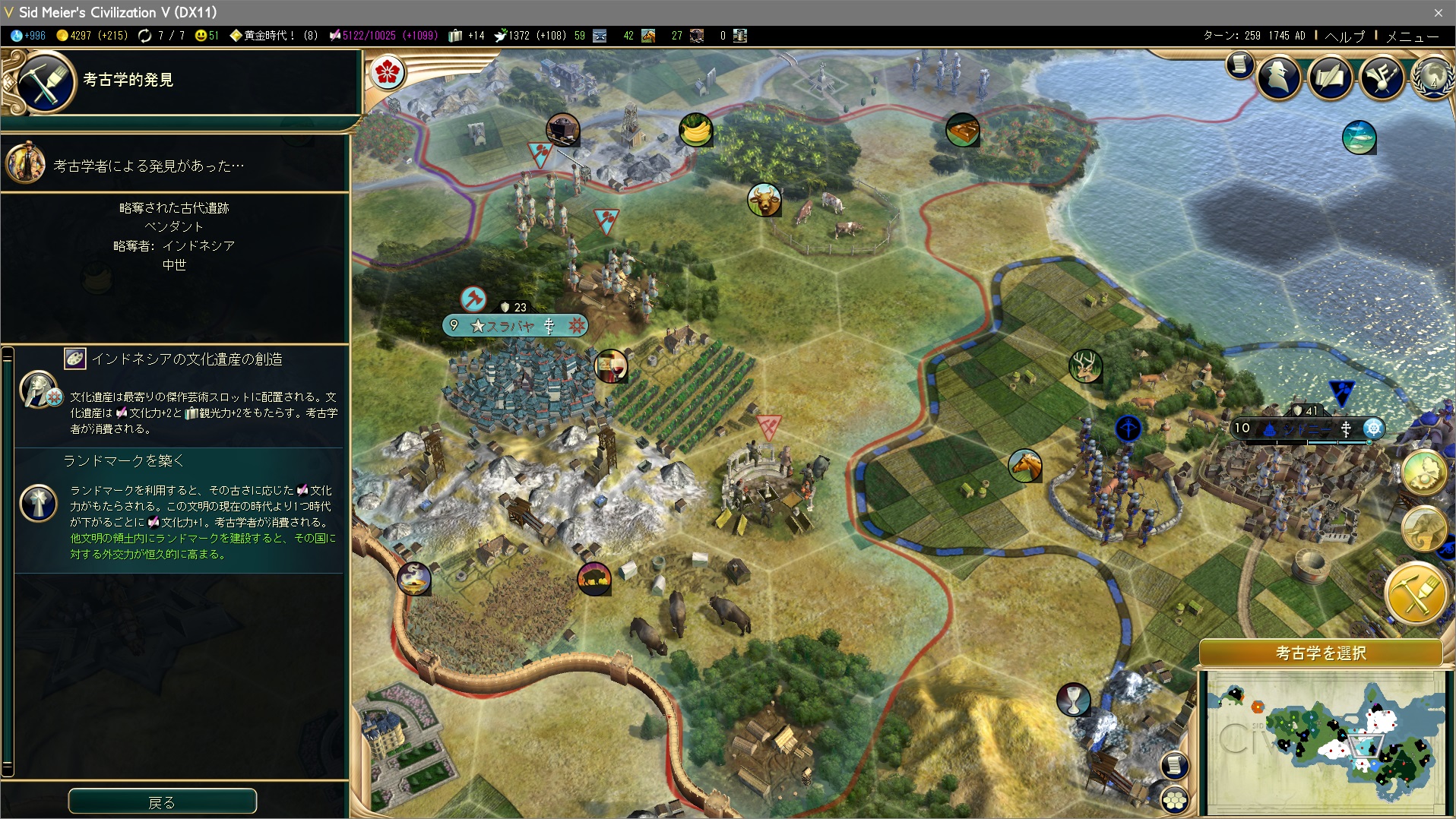 AI文明(都市国家)の文化圏にランドマークをつくってやると、友好度ボーナス(都市国家は影響力)が得られるぞ。高難易度では敵の考古学者の方が早いので、低難易度限定だが。