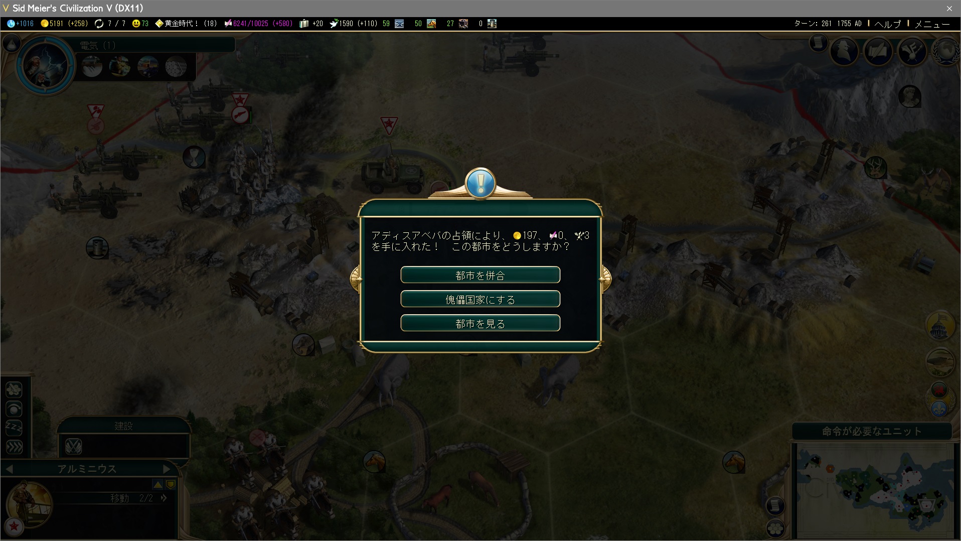 銃士隊(フランスのマスケット兵UU)がわらわらとやって来たので、遠隔攻撃で片付ける。空軍があれば敵軍を殲滅しながら移動できるのだが、それはまだ先の話。