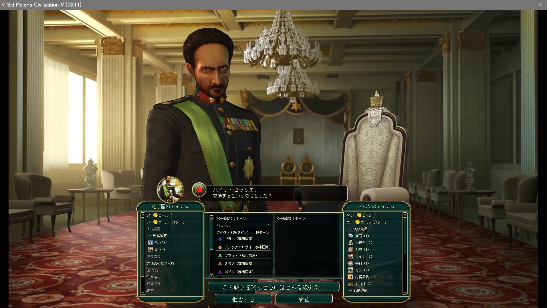 都市3つの文明と戦争する場合、首都占領(3-1=2)、即和平交渉で都市獲得(2-1=1)がテンプレだ。残り都市1つでは渡せる都市がないからな。ちゃんとユニットを殲滅しなければ有利な条件で和平交渉は行えないぞ。