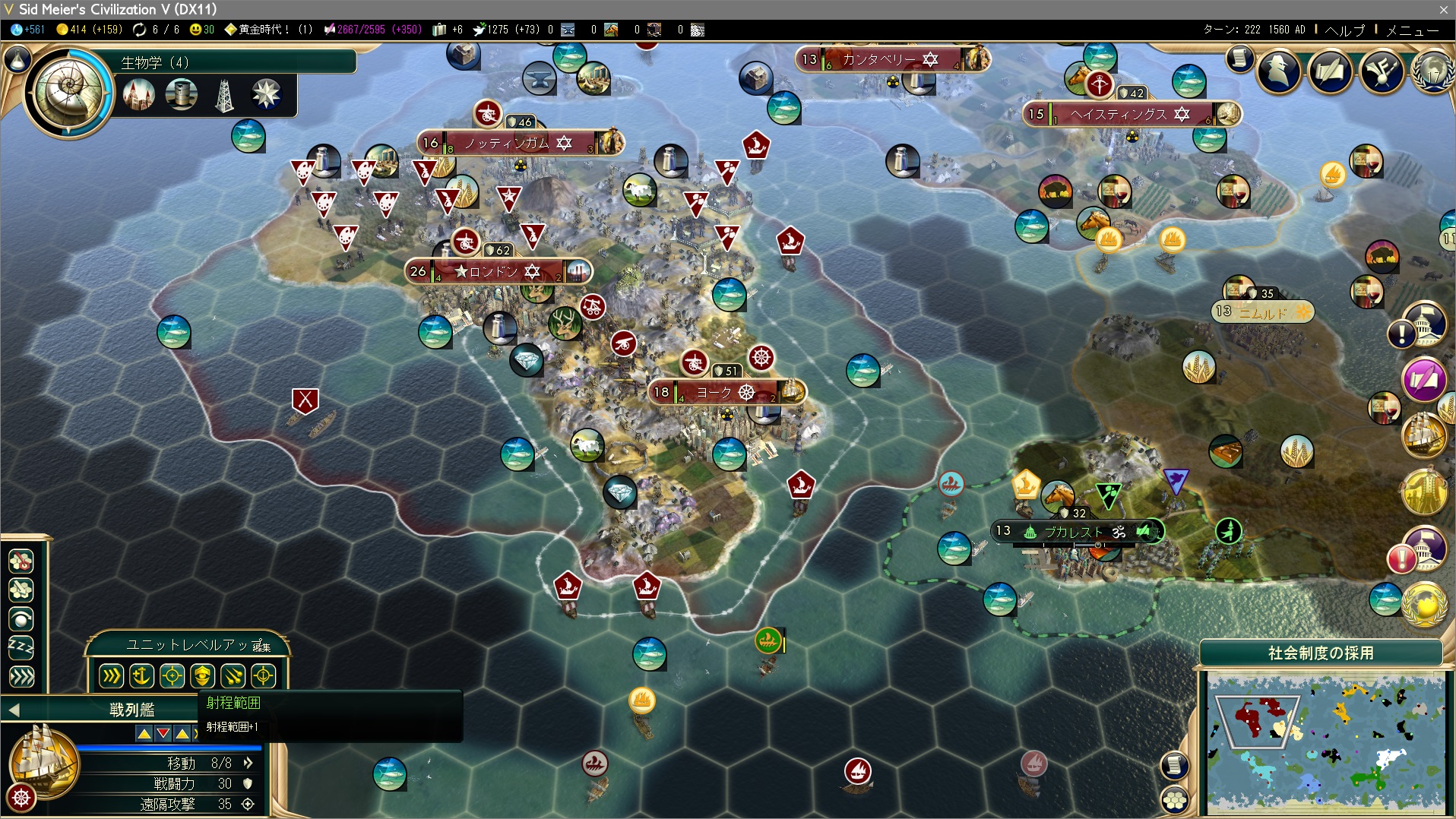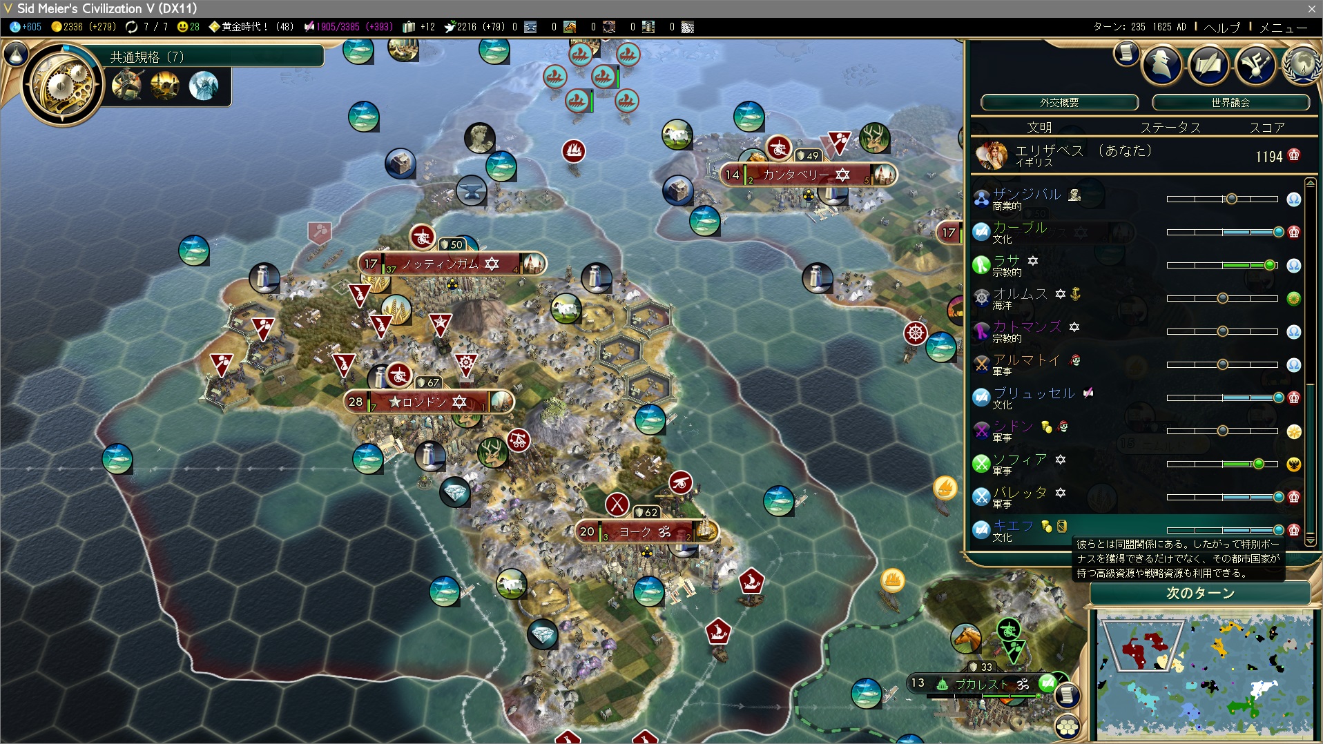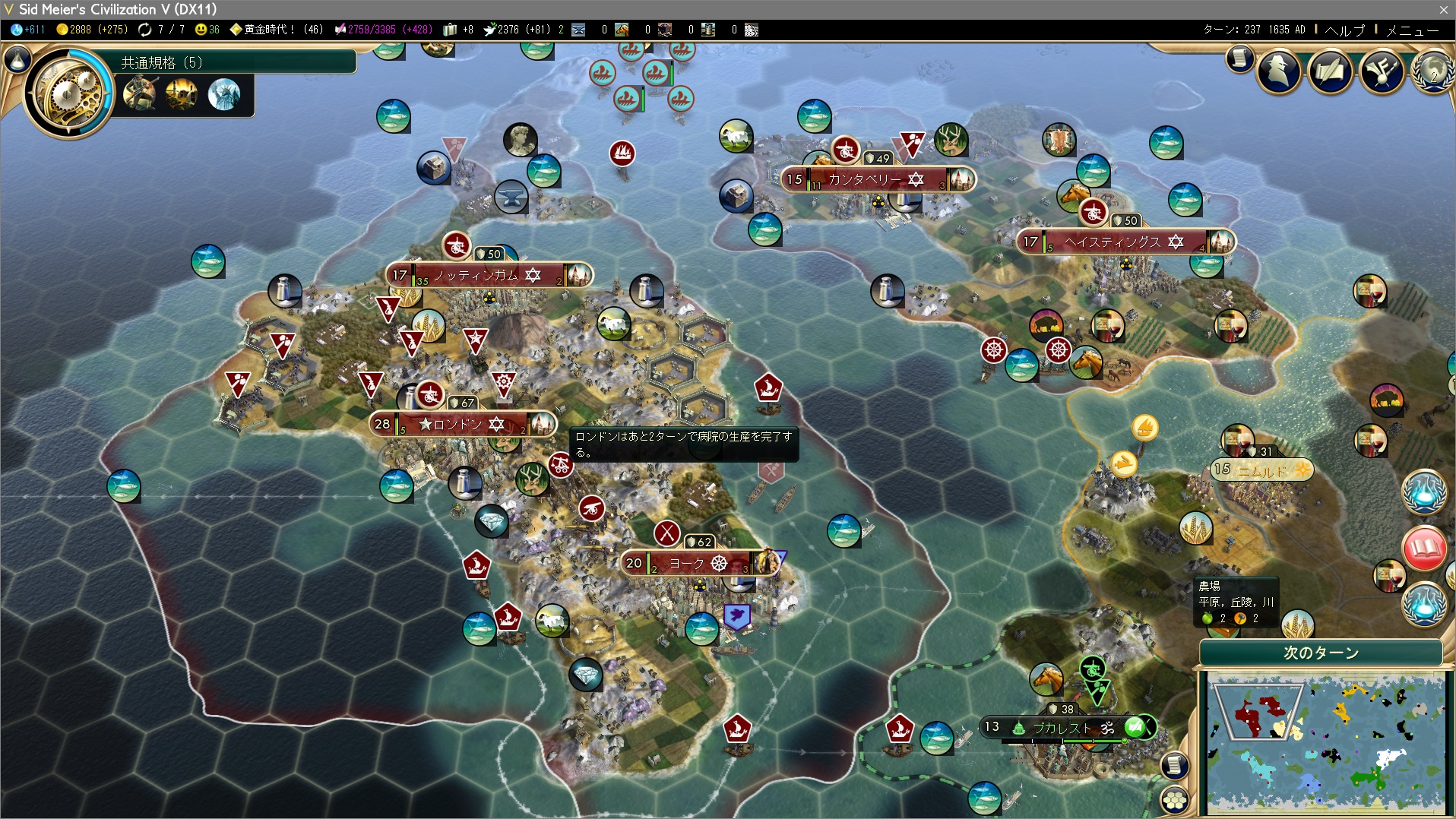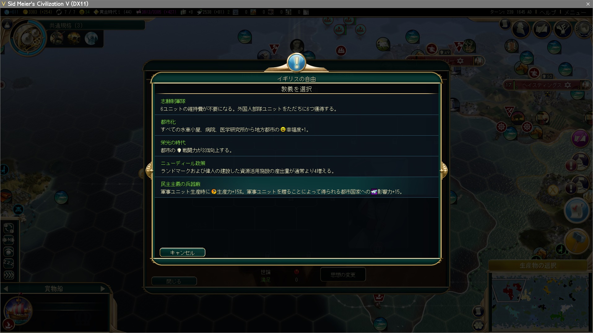 自由レベル2は当然、普通選挙を選択。同時に大芸術家×5を使って黄金時代を60ターン延長。