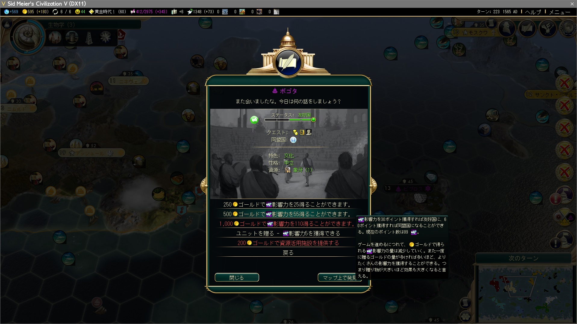 都市国家画面の[同盟国:]のアイコンにマウスカーソルを当てることで、影響力の差が確認できます。ギリシャUAも考慮しつつ、しばらく同盟を奪われないようにゴールドを支払う。