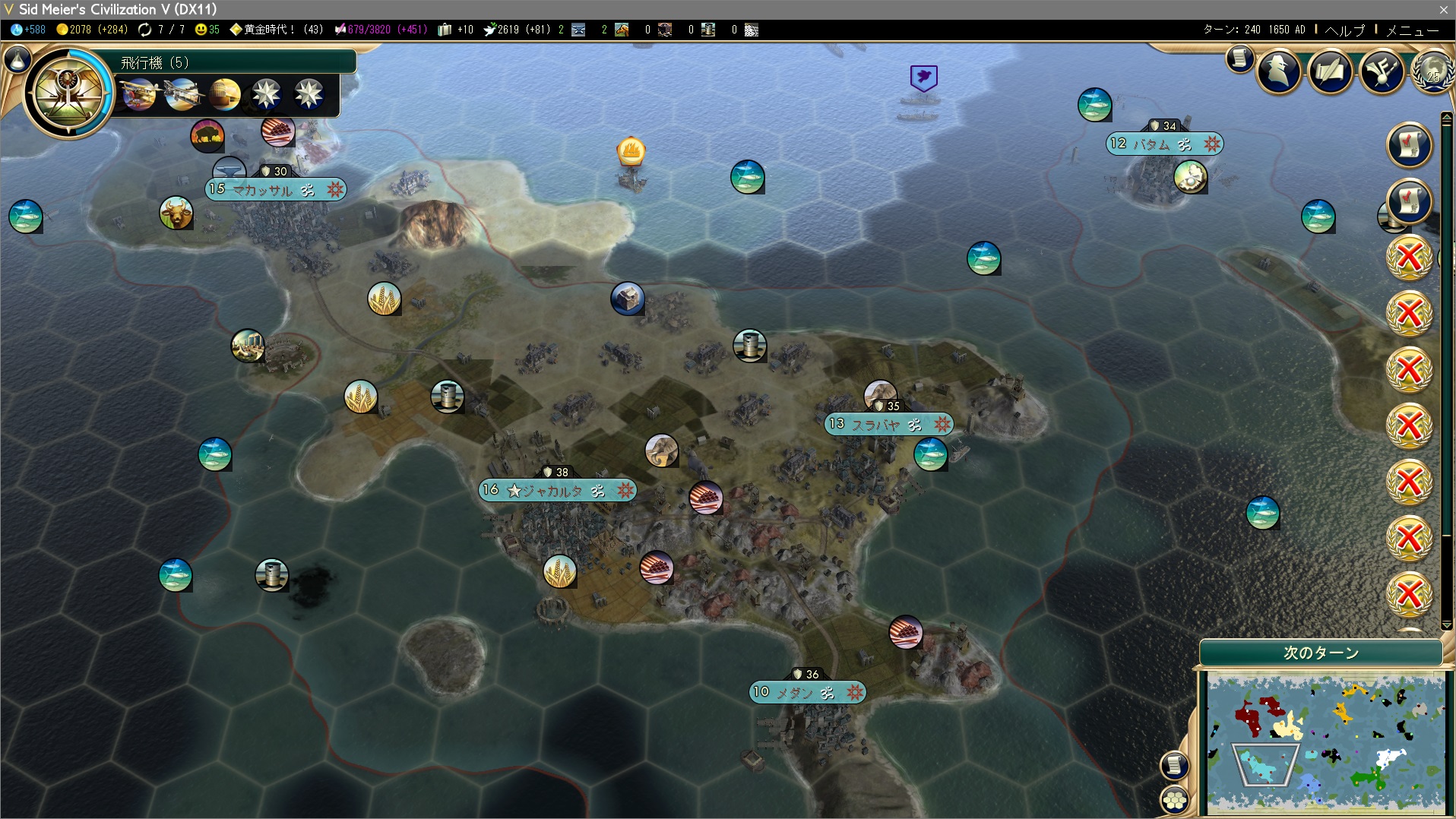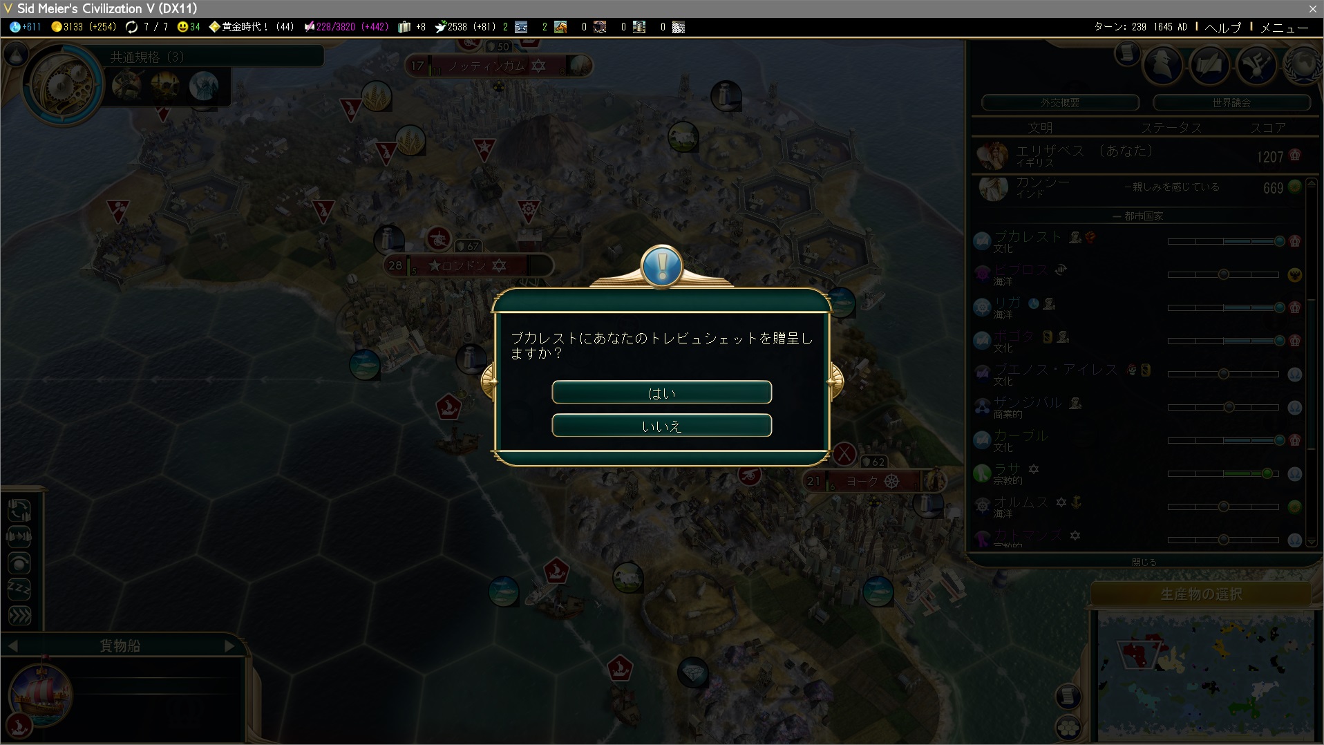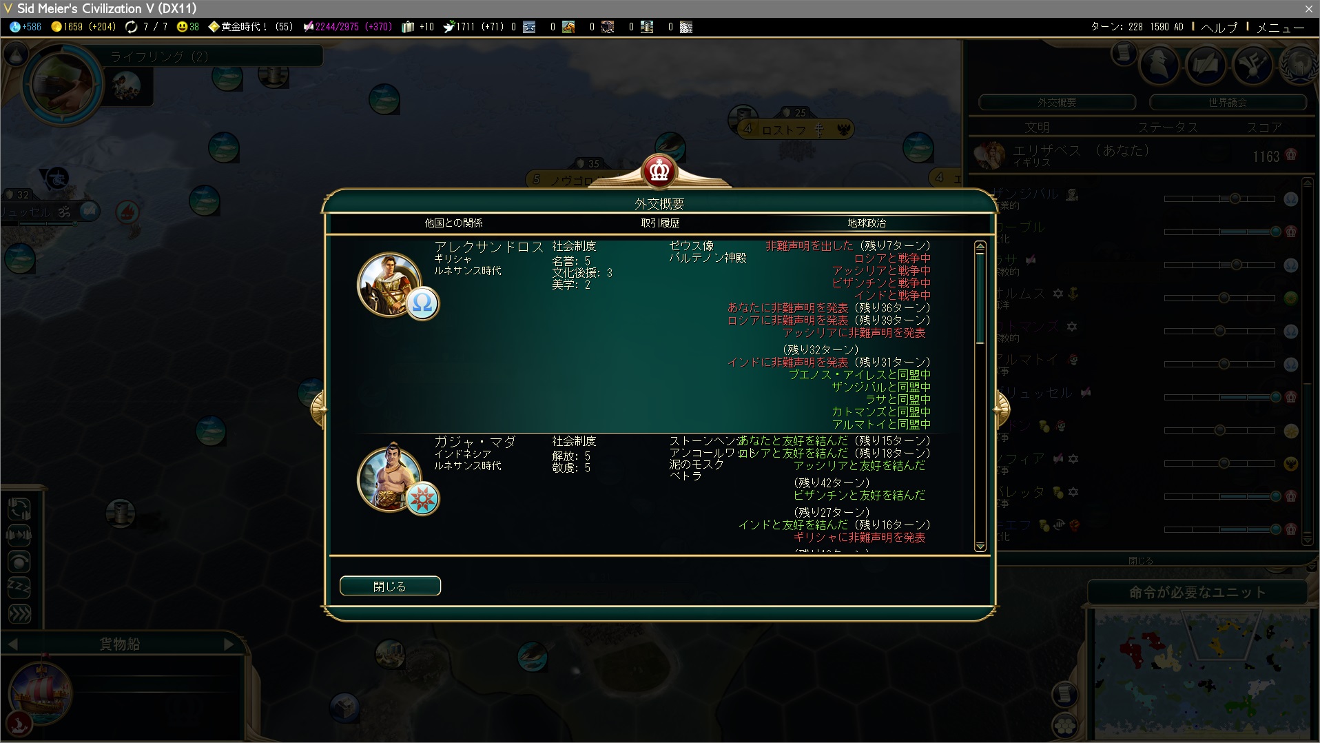 さて、宣戦依頼で万博ハンマーを奪ういつものアレですが、戦争中でない文明はフンとインドネシア。