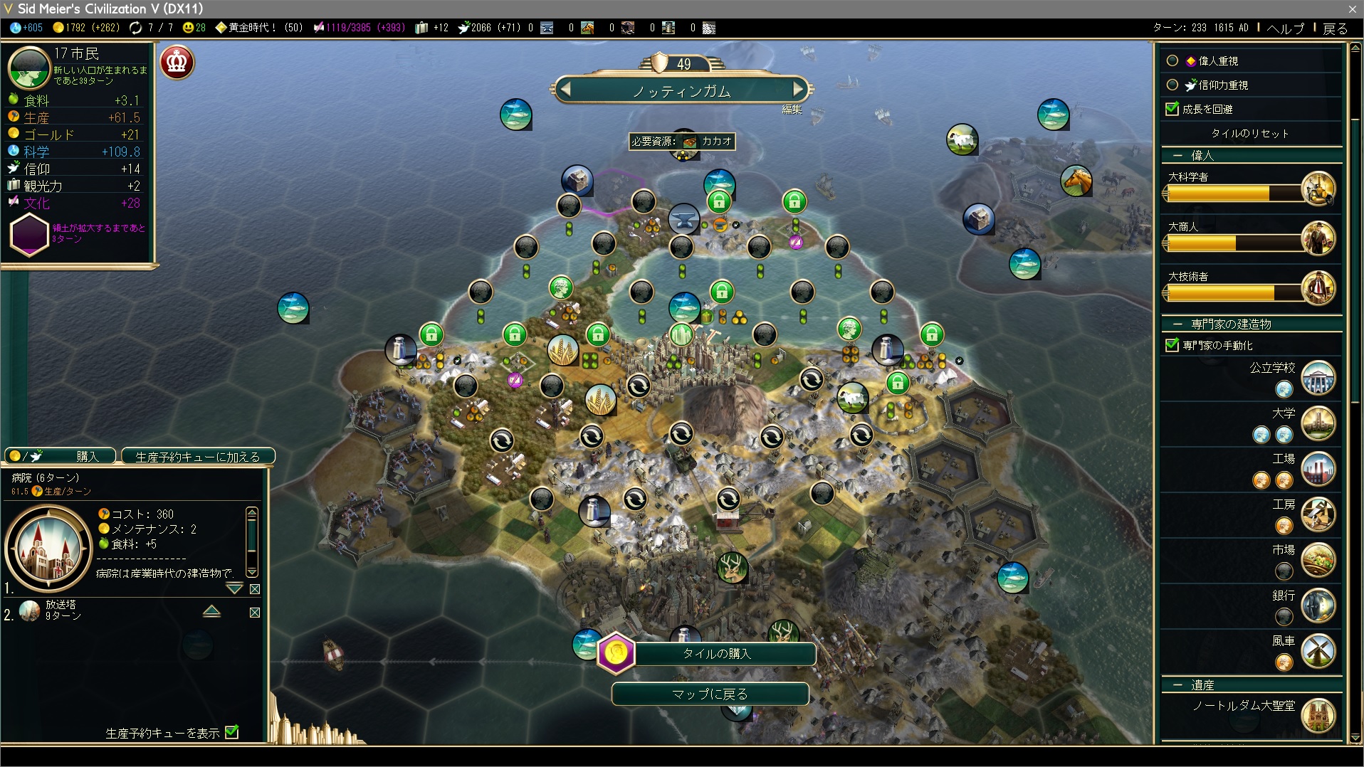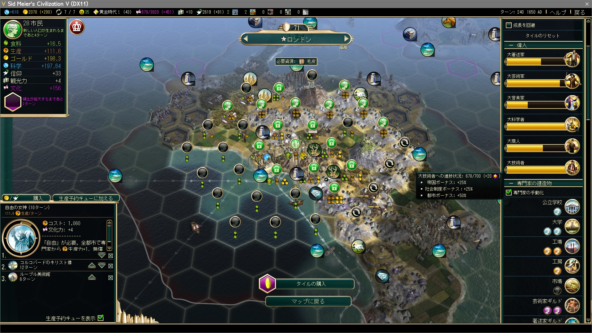そこで科学者の雇用をストップし、大技術者を先に誕生させる。生産予約キューには自由の女神&コルゴバードのキリスト像&ルーブル美術館と、いま欲しいのは大技術者ですから。