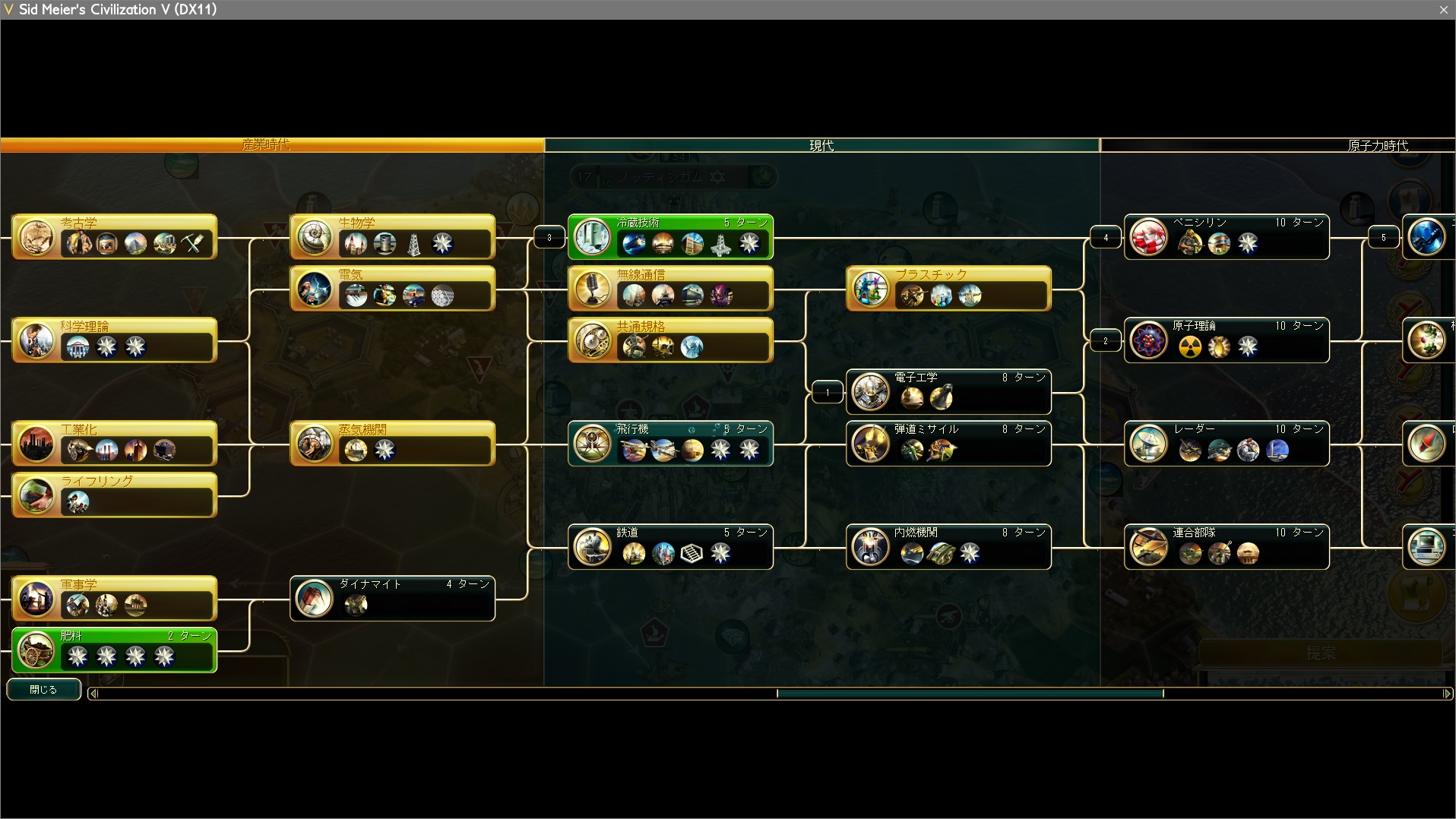 ですが注意事項がひとつ。文化勝利には空港が必要なのでレーダーを獲得しましたが、外交勝利には特に必要ないです。そして多島海なので肥料→ダイナマイト→鉄道もスルー。