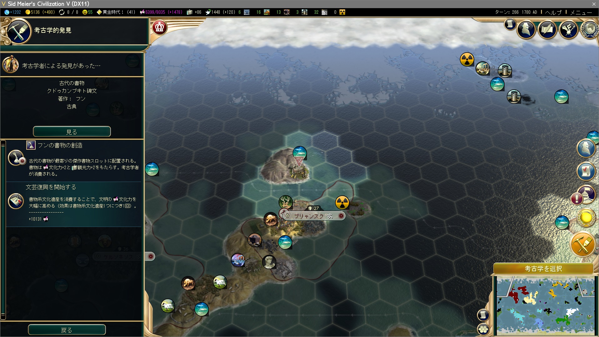 隠された史跡から書物を引く。終盤に傑作著述なんてもらっても使い道がないので当然文芸復興。まあ社会制度の方ももう使い道は…