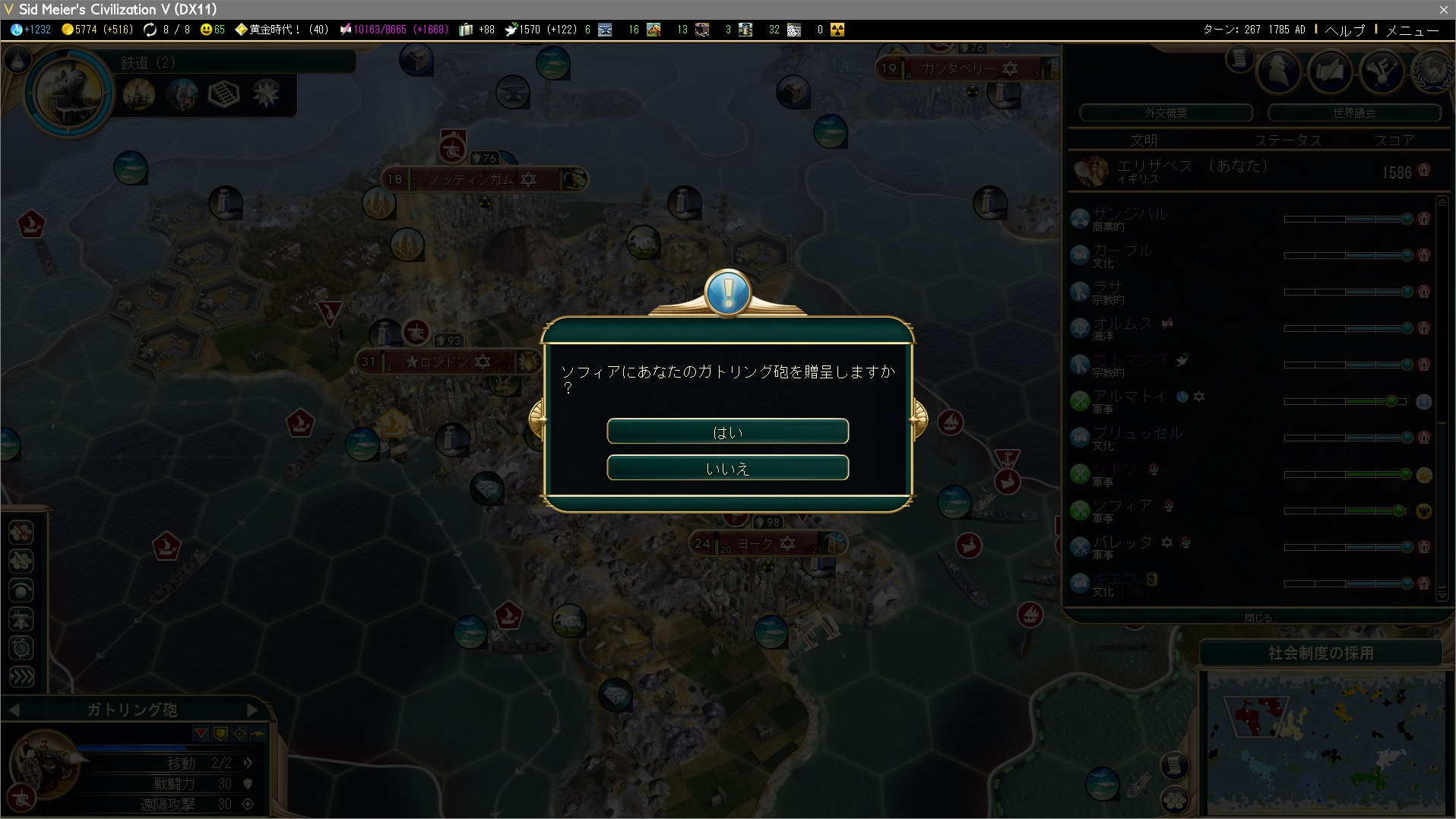 さて、現在2つ都市国家と同盟できずに38票。世界的思想で+2、残り都市国家で+4、外交官1人追加で+1、合わせて45票で外交勝利が可能です。