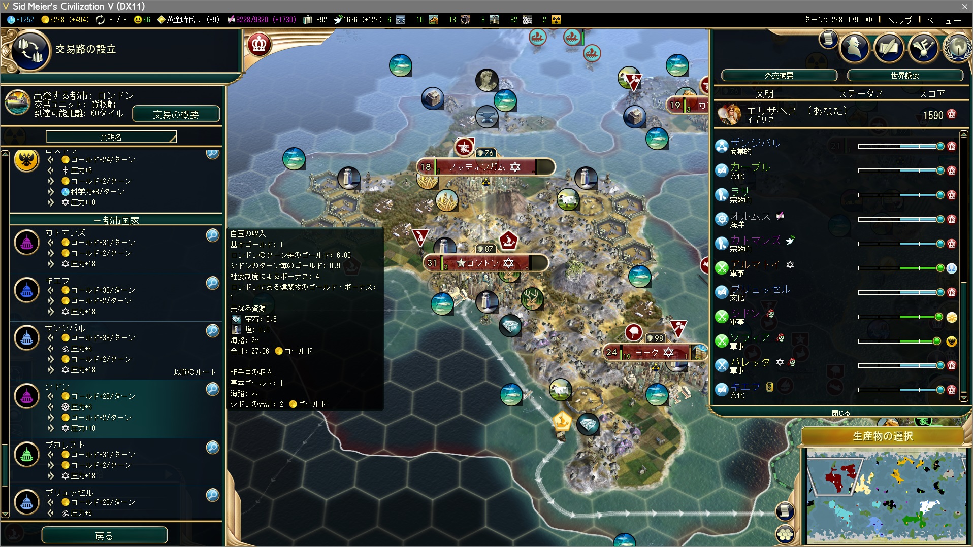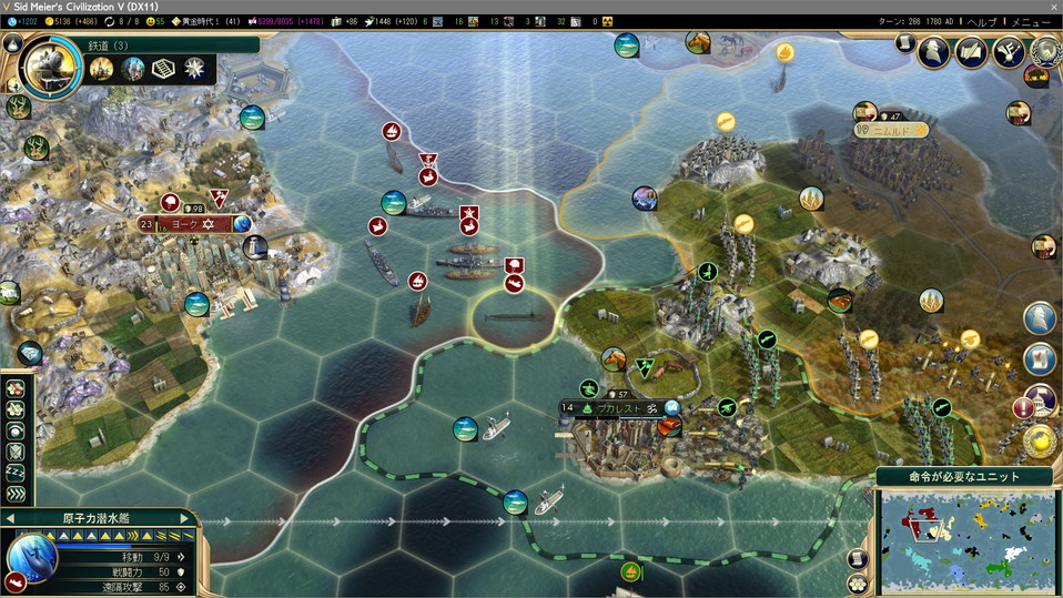 次にゴールド。ゴールドを稼ぐにはやっぱり戦争。今回は海マップかつ鉄と石油がなかったので戦争できませんでしたが。隊商ではゴールドをなかなか稼げないので、外交勝利は少し遠のく。