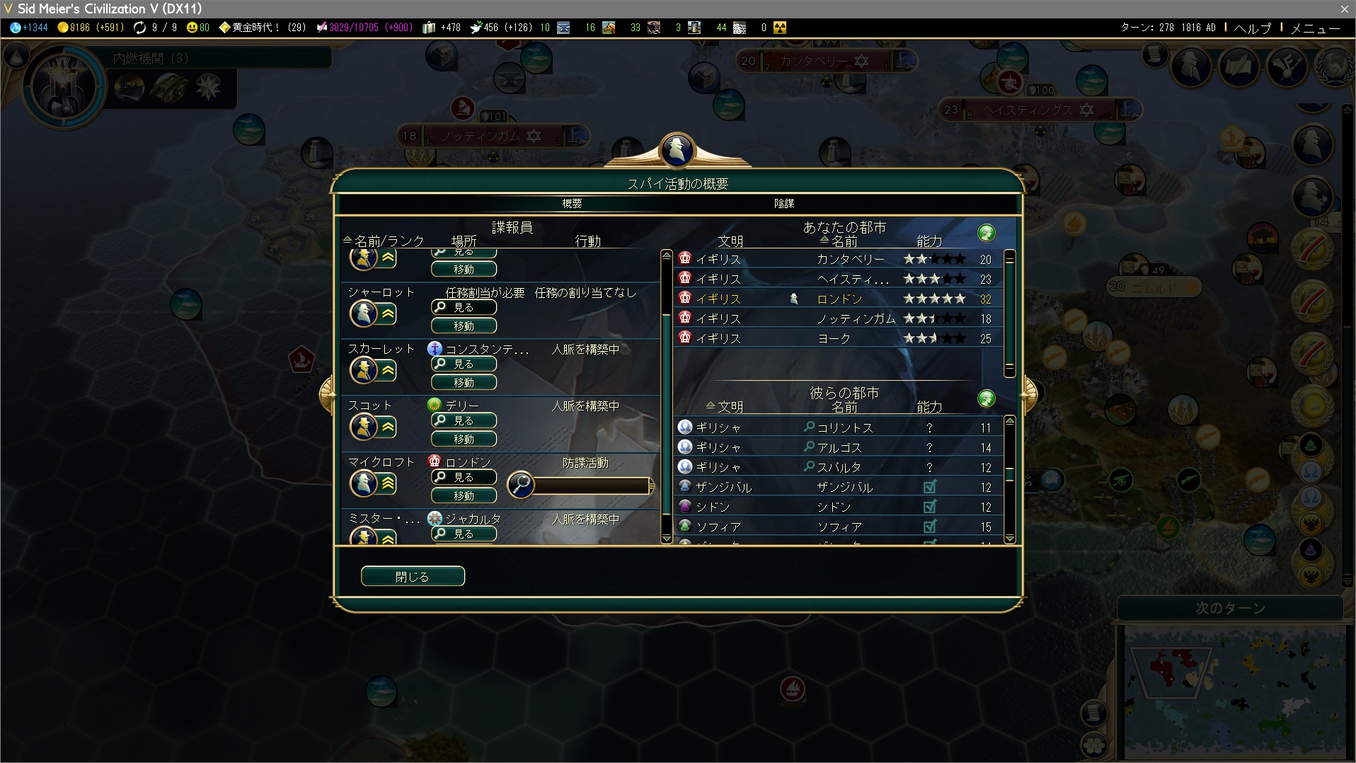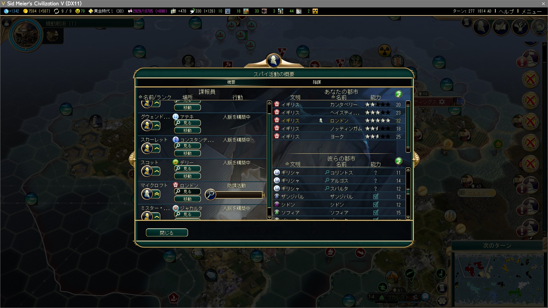 多島海外交勝利はこんな感じです。予定では条約機構だけで勝つんじゃないかと思ってましたが、採用前にほとんどの文化都市国家と同盟できていましたね。ちなみに熟練スパイの政変ゼロです。