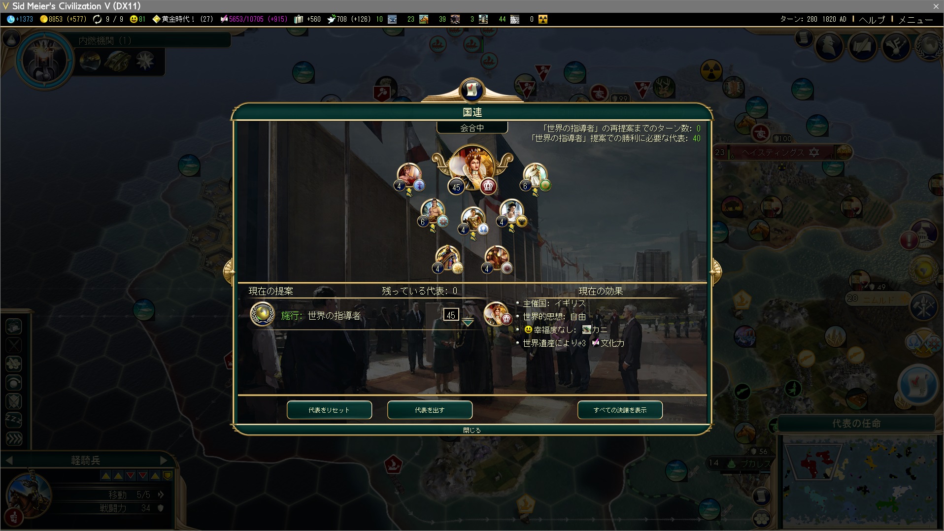 世界の指導者選挙。外交勝利に必要な40票を上回る45票。ここで間違えてプレイヤー文明以外に票を入れると敗北するわけですが、このミスやっちった人っているんですかね?