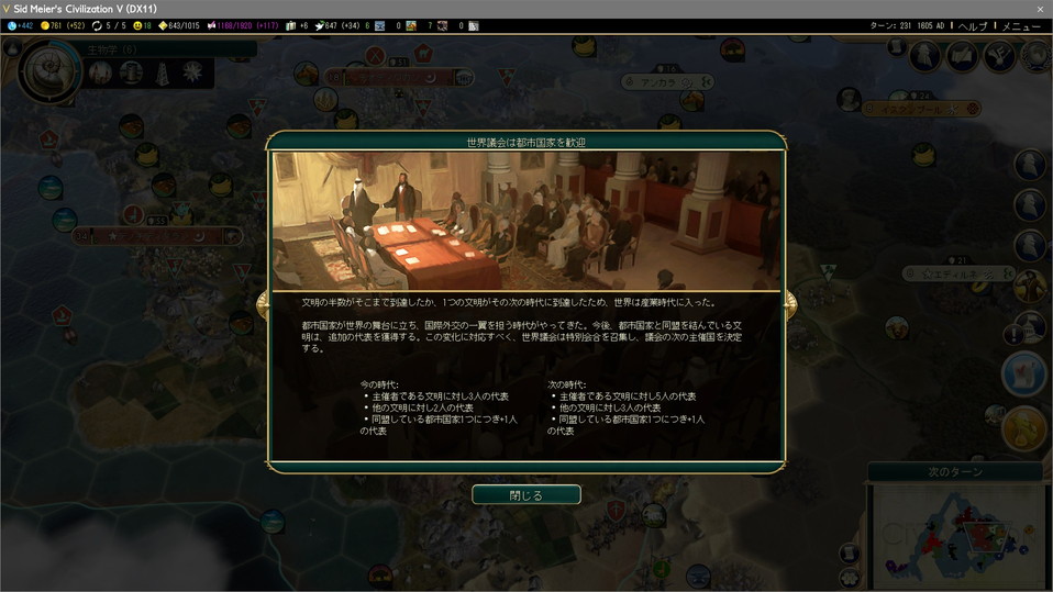 世界議会がルネサンス仕様から産業時代仕様に遷移。 文明の半数がその時代に到達orその時代の次の時代に到達した文明がいると、世界議会がレベルアップ(?)する。プレイヤーが現代入りしたから世界議会が産業時代入り。