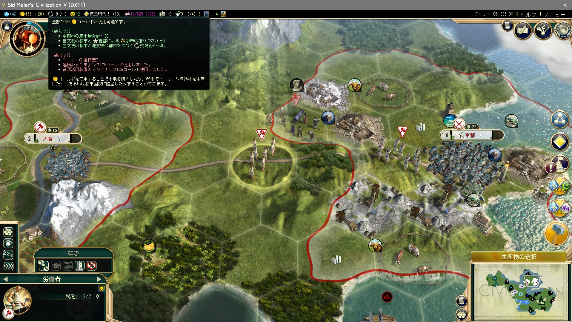 画面に収めるのがギリギリなくらい遠い。第二都市大阪からユニットを移動するのに10ターンはかかってしまうな。これでは労働者の改善が遅れるし、道路も敷けない、戦争が起きたら守りにくい、の三重苦だ。