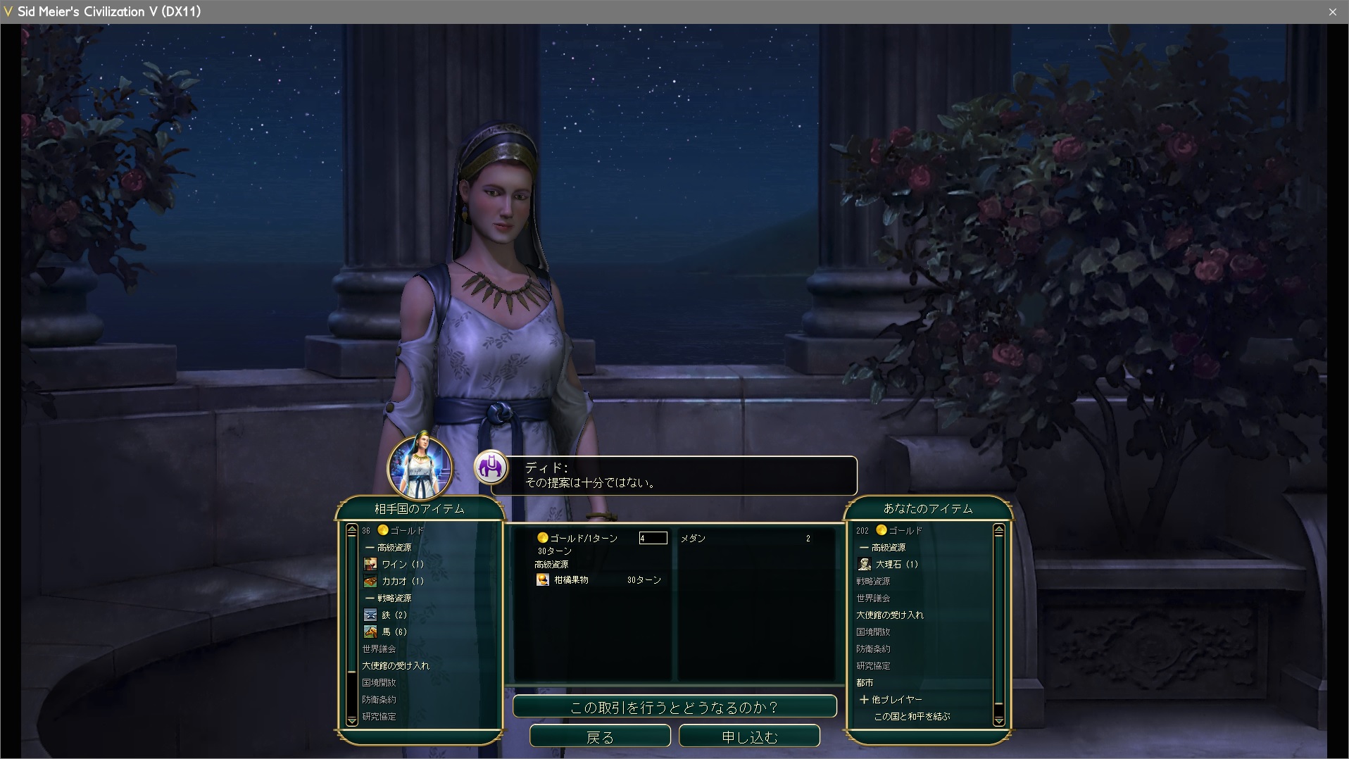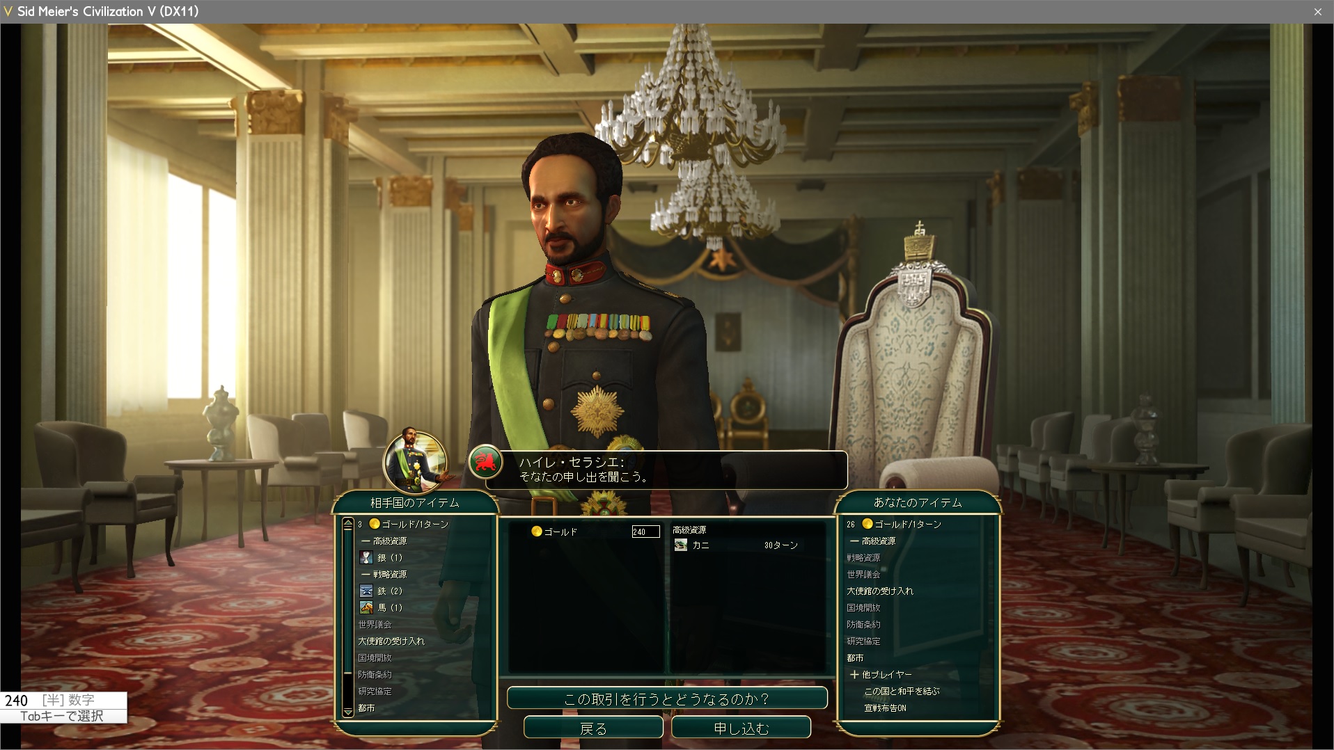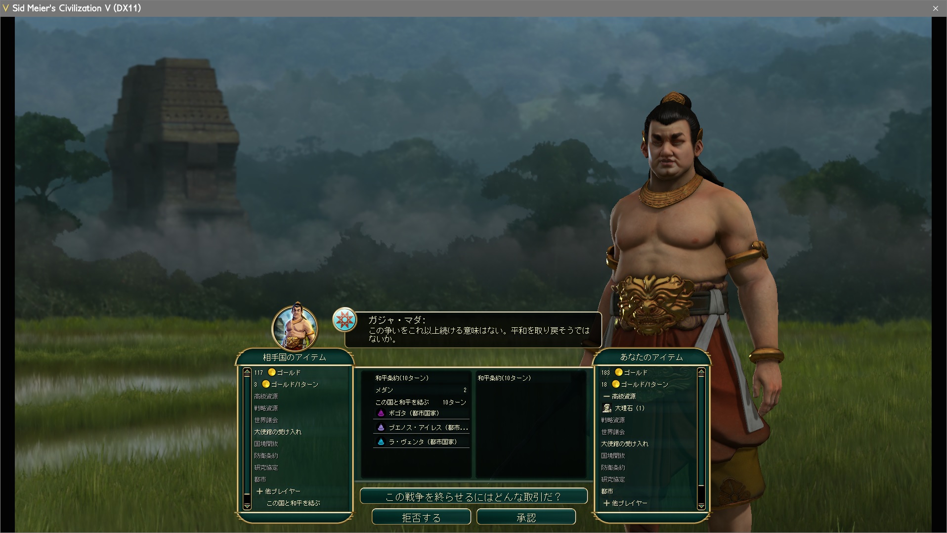 戦争に勝ち続けていると、和平交渉の条件が対等講和→大量のゴールドと資源→都市、という有利な内容に推移していく。これは都市を占領したからではなく、敵の軍事力がこちらに比べ相対的に減少したのが原因だ。