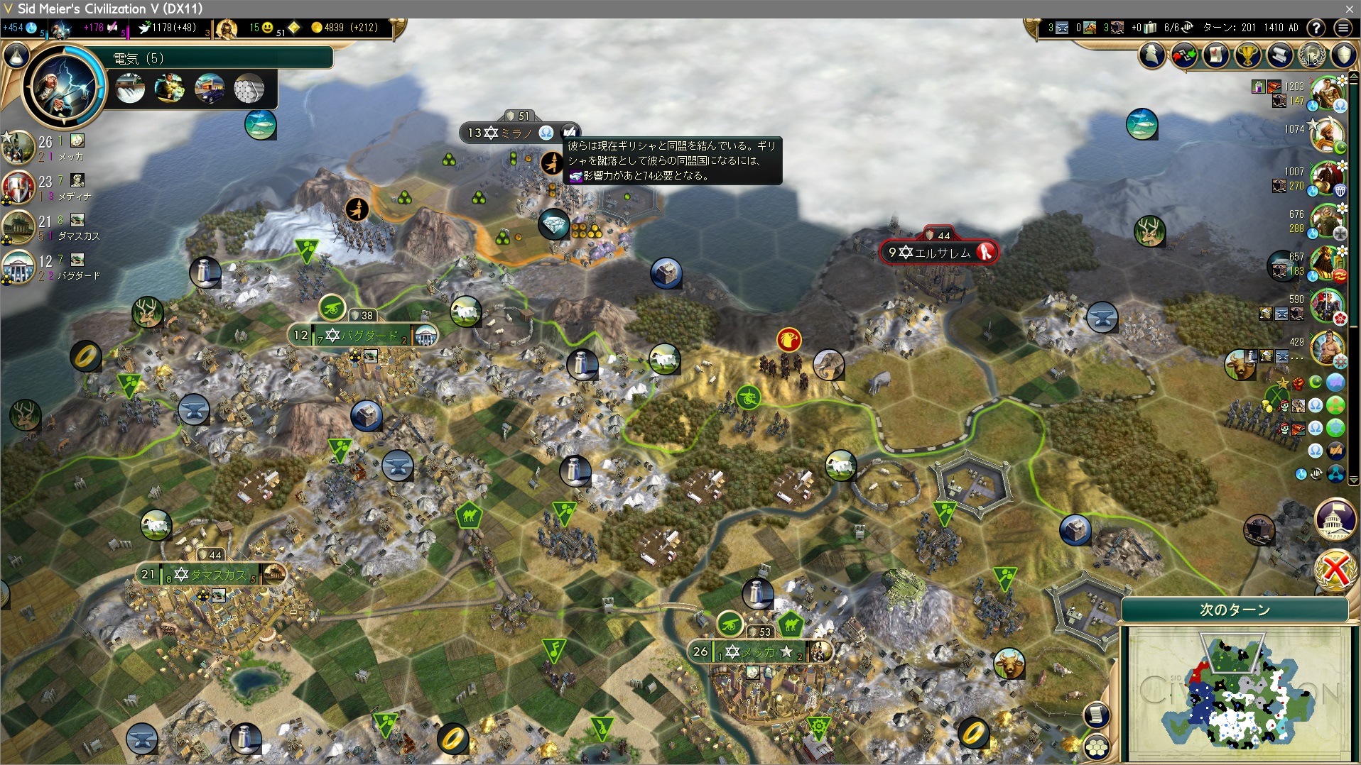 背後には都市国家ミラノ、エルサレム。北と南の二正面作戦ほど愚かなもんもないので、こことも同盟が必要。こんな感じで戦争の邪魔になりそうな都市国家は無理矢理引き抜く。