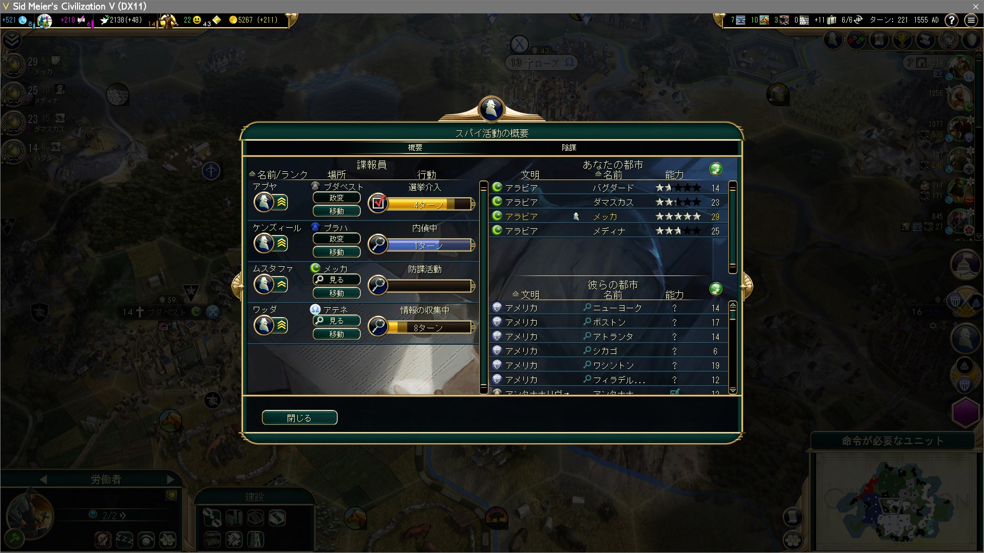 不死ギリシャ相手だと都市国家の同盟を奪うのにゴールドだけでは心もとない。よって国家情報局を建てることで熟練スパイを増やすことに。