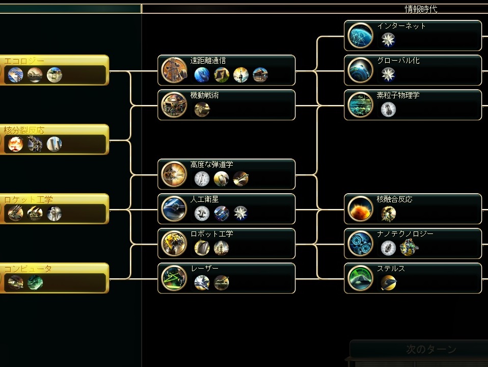 ロケット工学→原子理論→核分裂反応→高度な弾道学→人工衛星→ペニシリン→エコロジー→遠距離通信→機動戦術→素粒子物理学→内燃機関→連合部隊→コンピュータ→ロボット工学→ナノテクノロジー