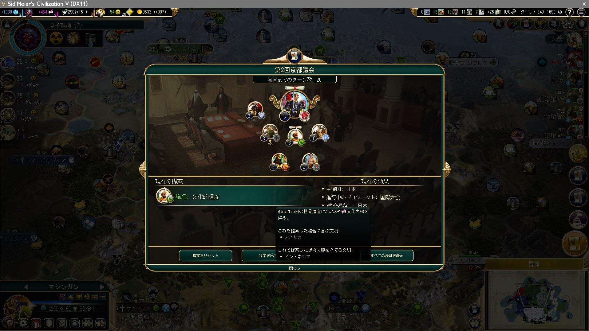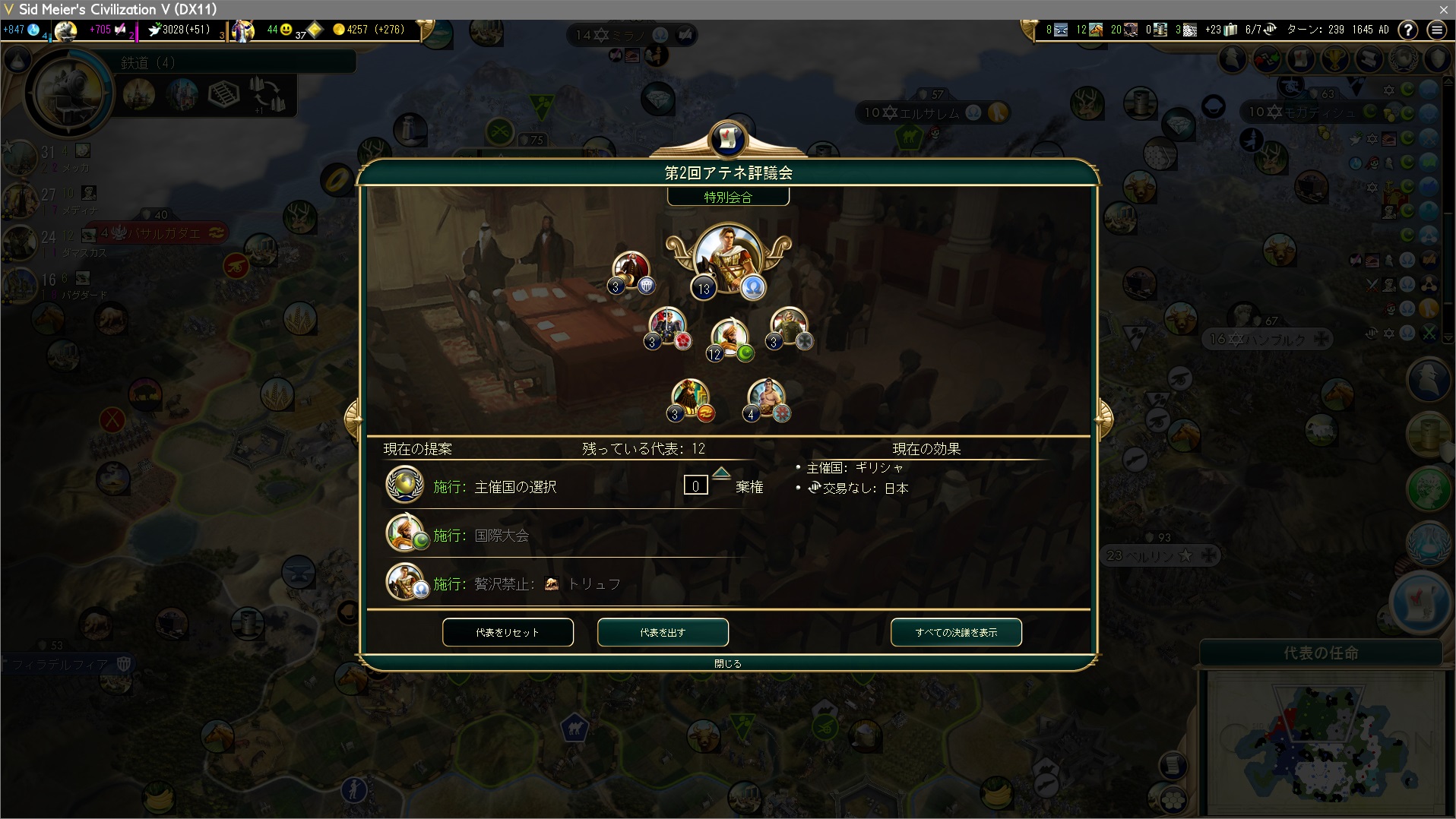世界議会が現代入り、主催国の選択。ギリシャに1票負けているが、ただでは転ばぬ!ここは日本に票を流すことで友好度ボーナスを稼ぐとしよう。
