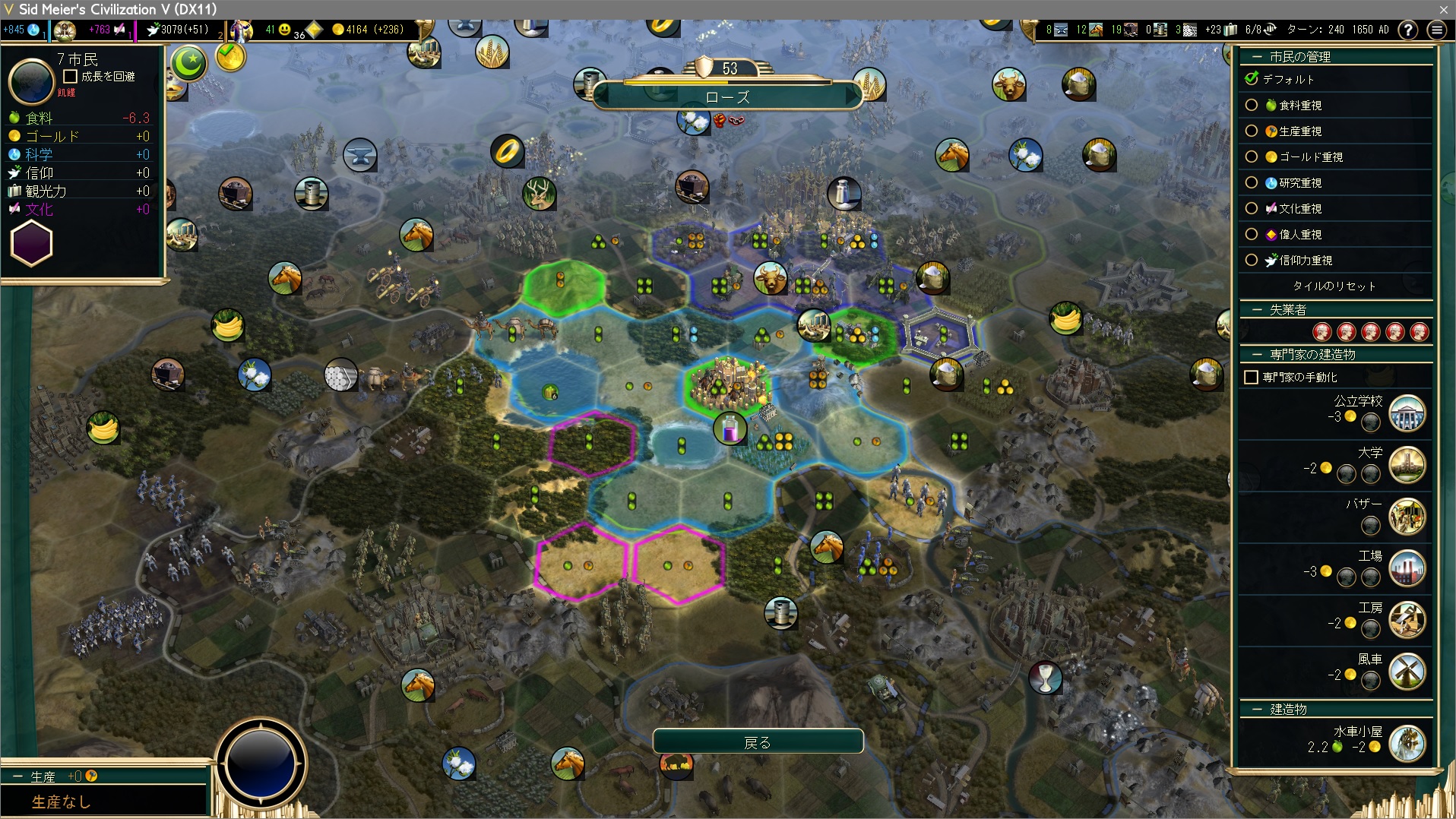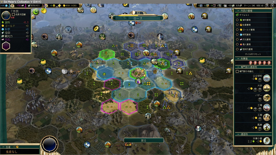 とはいえゲーム後半では都市の立地より専門家をどれだけ雇えるかの方が重要なので、高級資源1つしかないこの都市もそう悪いもんじゃない。