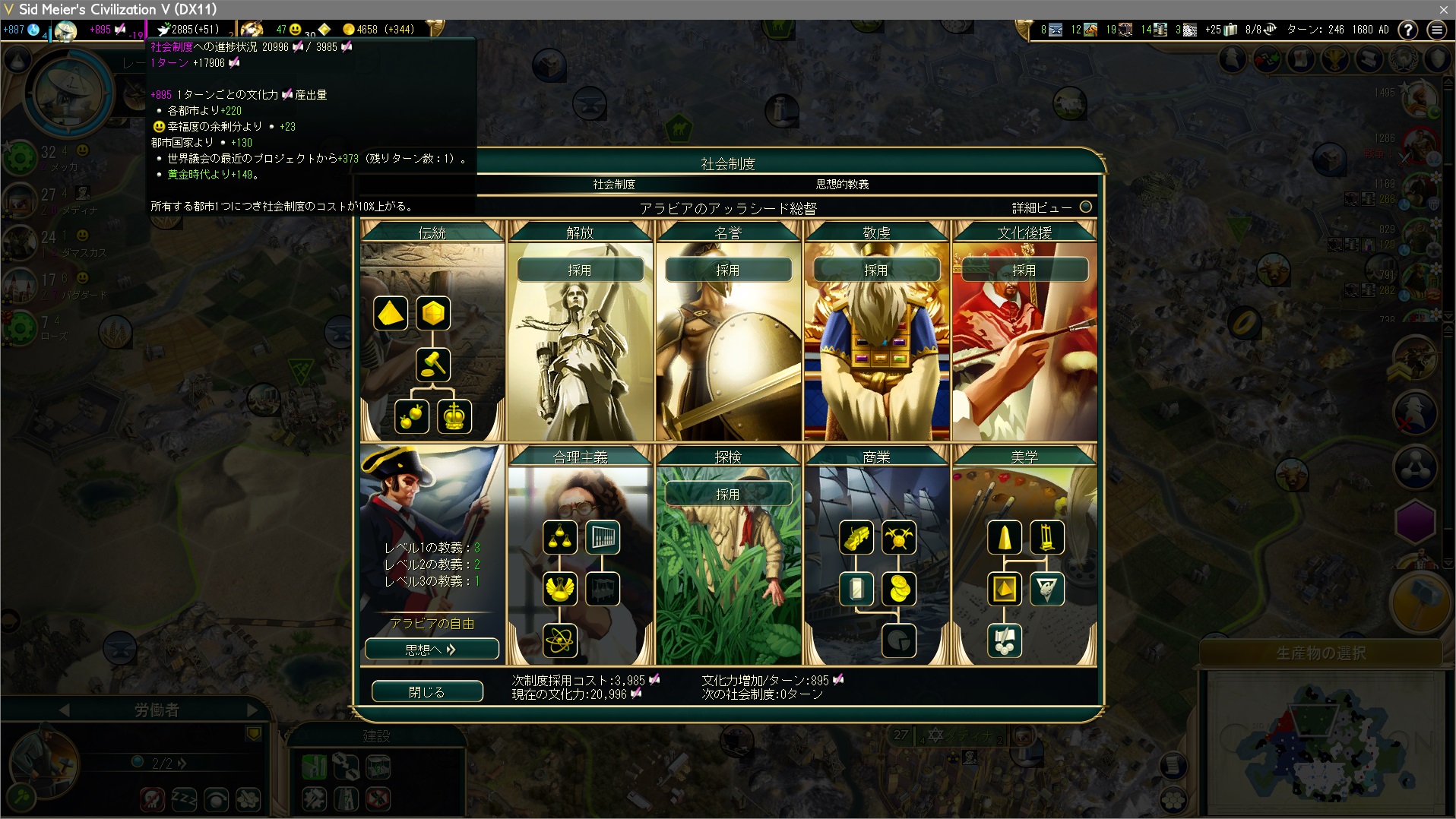 万博金賞の効果が次ターンで切れるので、大著述家を突っ込む。戦争で都市が増えると社会制度獲得のコストも上がるので、小国であるうちにあらかた獲得しておこう。