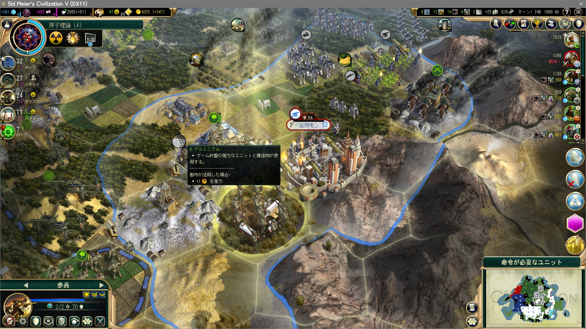 さあ都市国家を縦断して本土攻略だ!ってとこだが、ロケット砲が一晩でやってくれました。ギリシャはUUに白兵・騎乗をもつのでユニット生産も白兵・騎乗が多く手強いよ~とか解説しようと思ったのに。