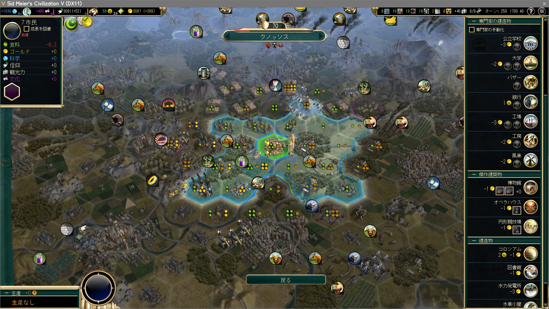 都市クノッソスを占領。立地はまあまあだが建造物が優秀。難易度が高ければAI文明の生産力も高く、戦争で分捕った都市にはたくさんの建造物を用意してくれているぞ。