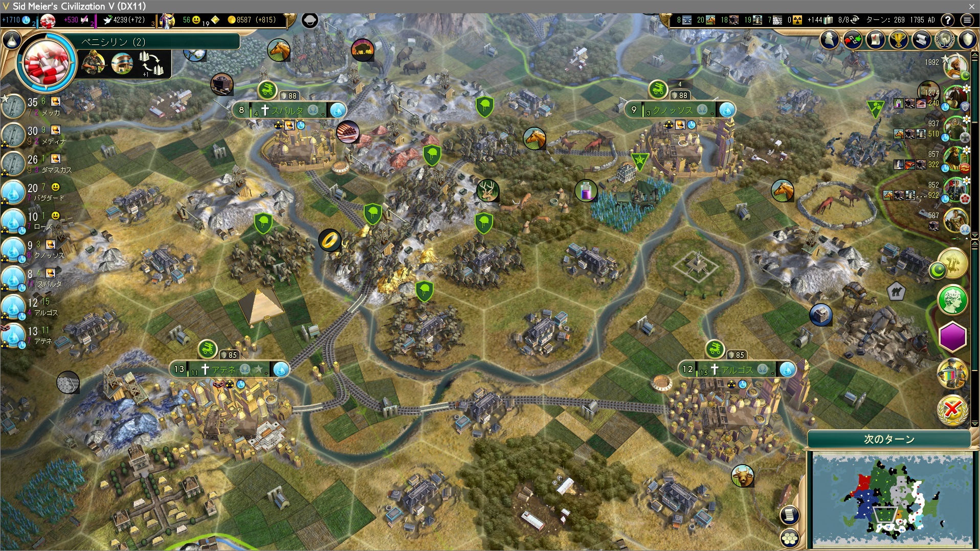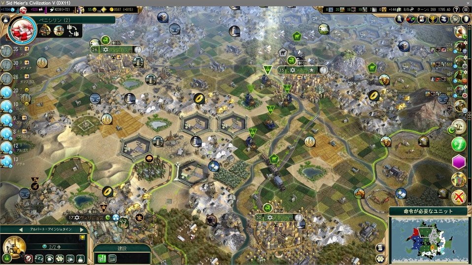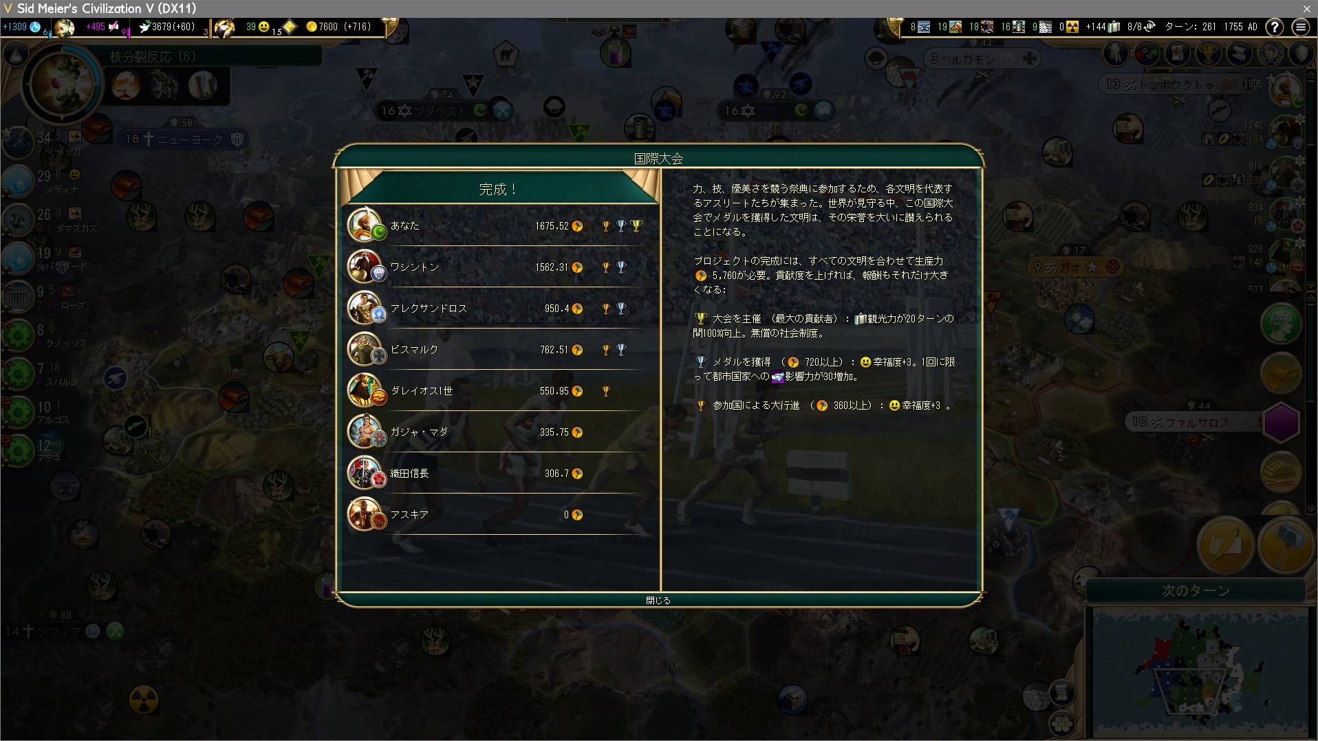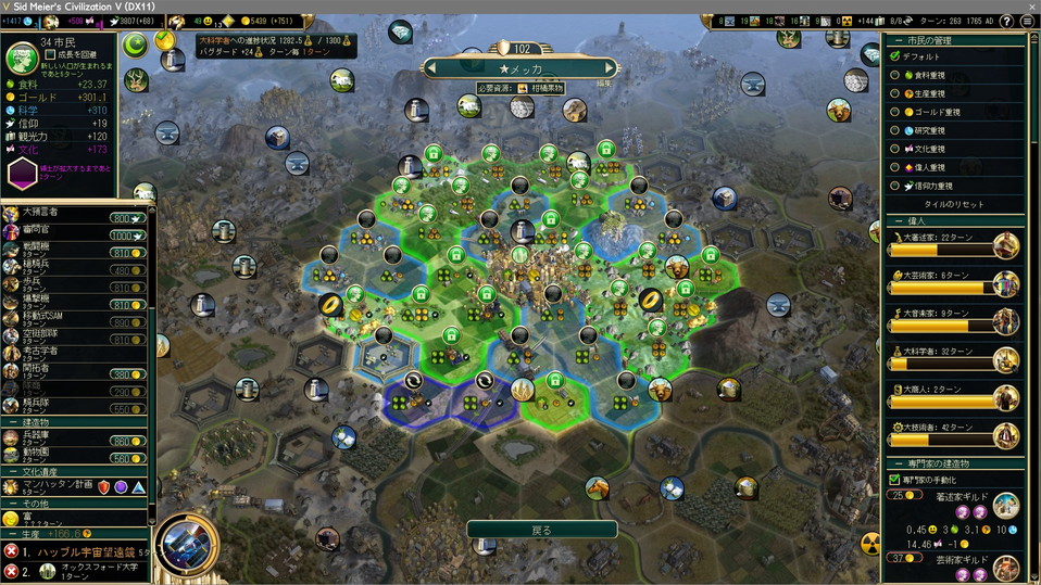 手空きの都市全てで科学力の生産。裁判所やホテルなどが建っていないが、もうすぐ勝利するのだからんなもんもはや必要ない。
