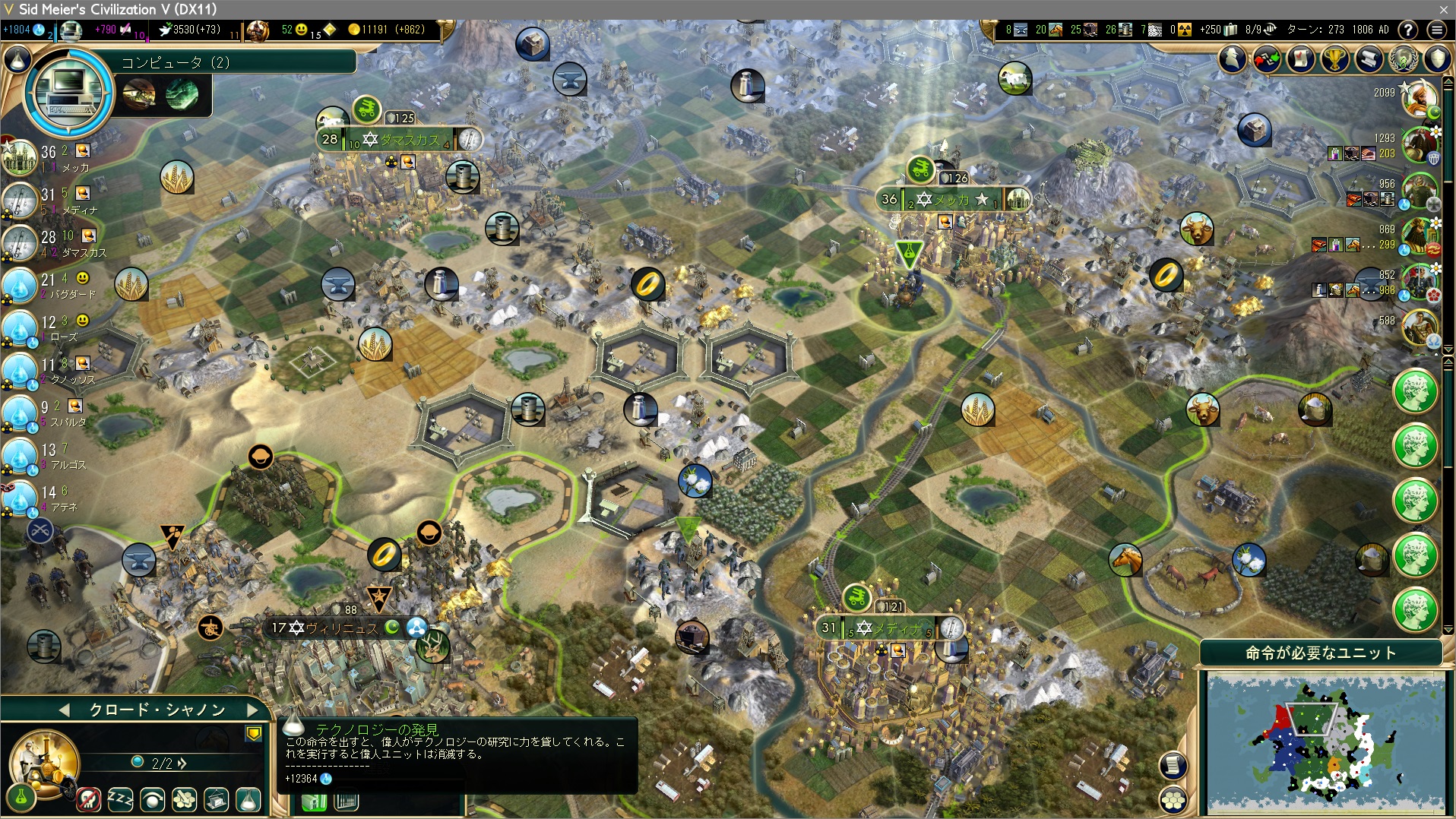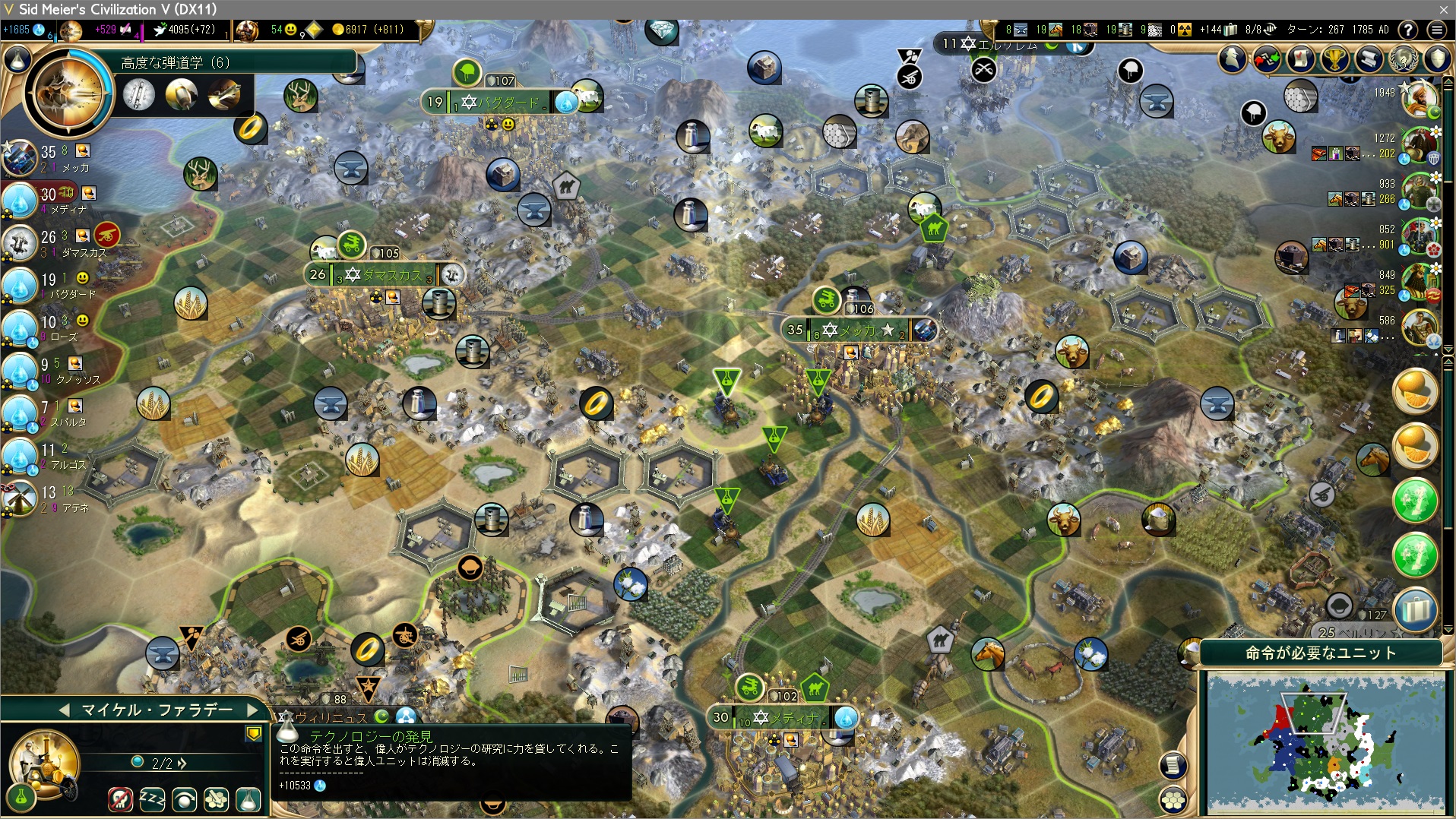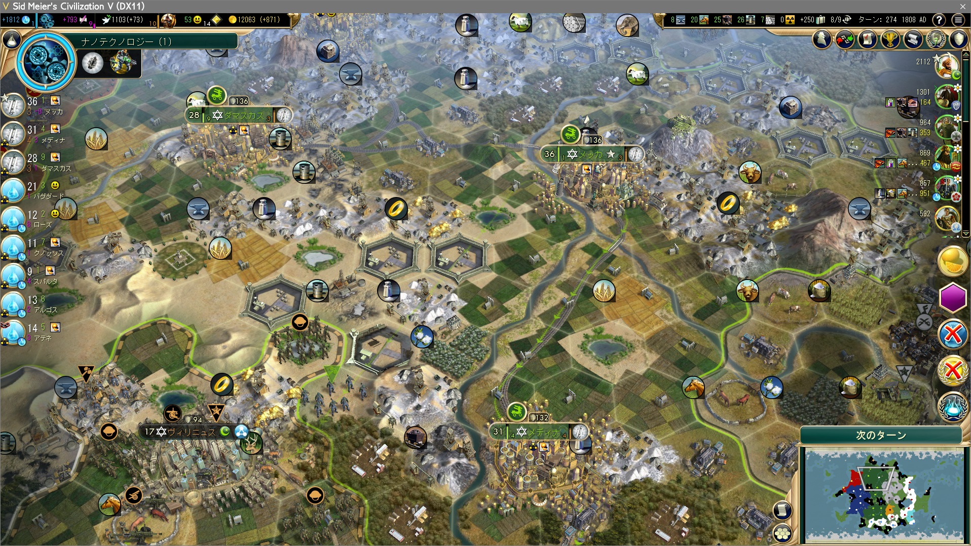 手空きの都市全てで科学力の生産。裁判所やホテルなどが建っていないが、もうすぐ勝利するのだからんなもんもはや必要ない。