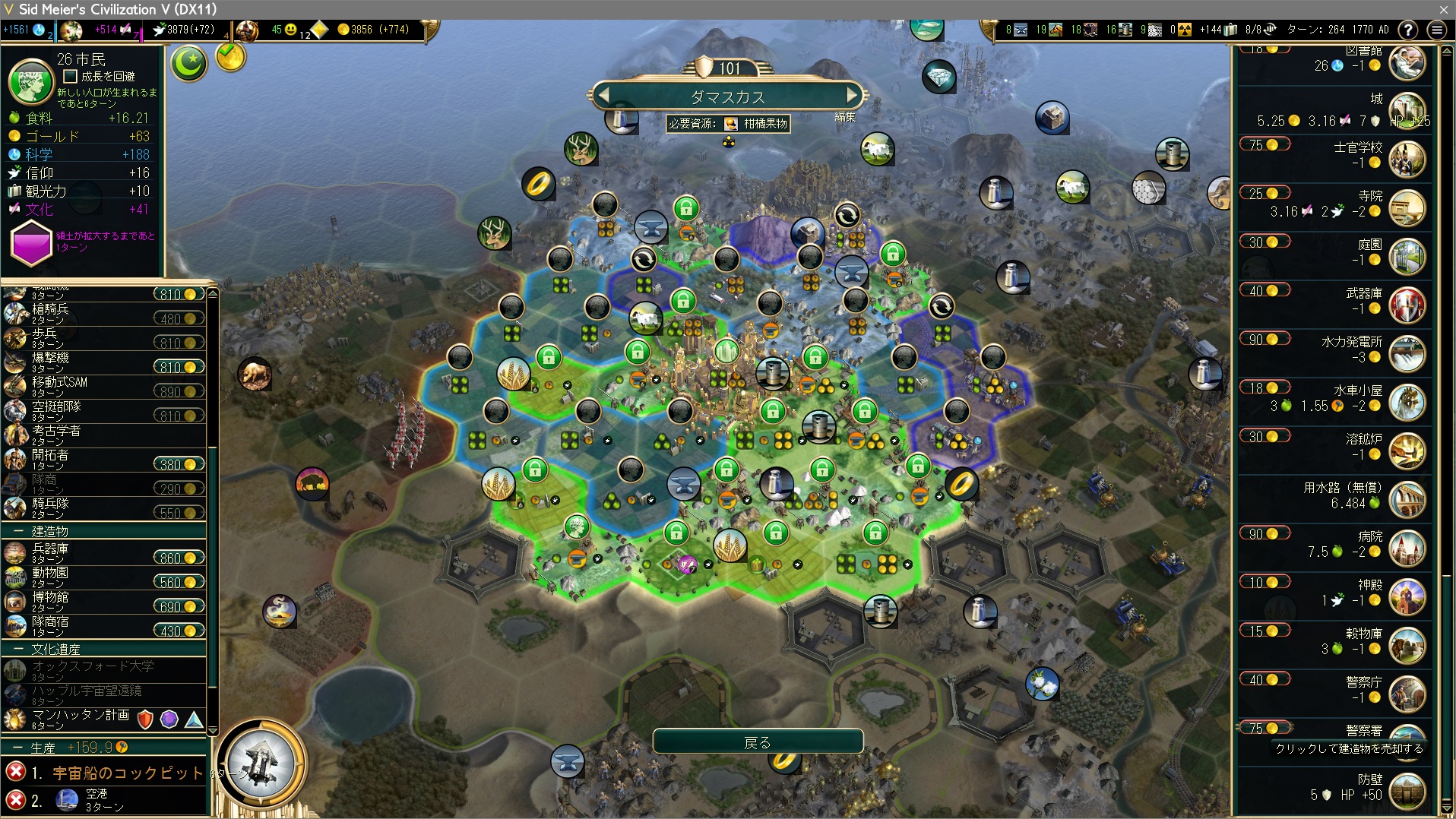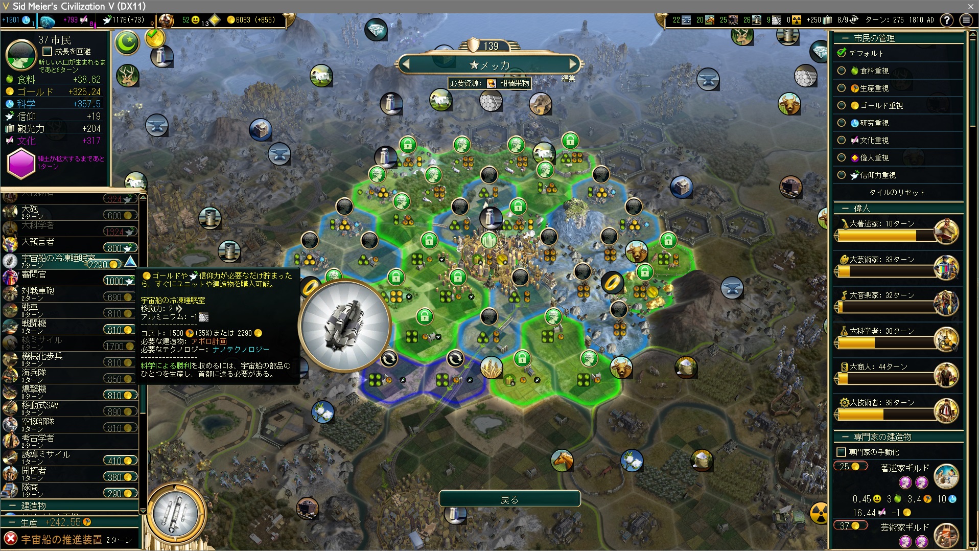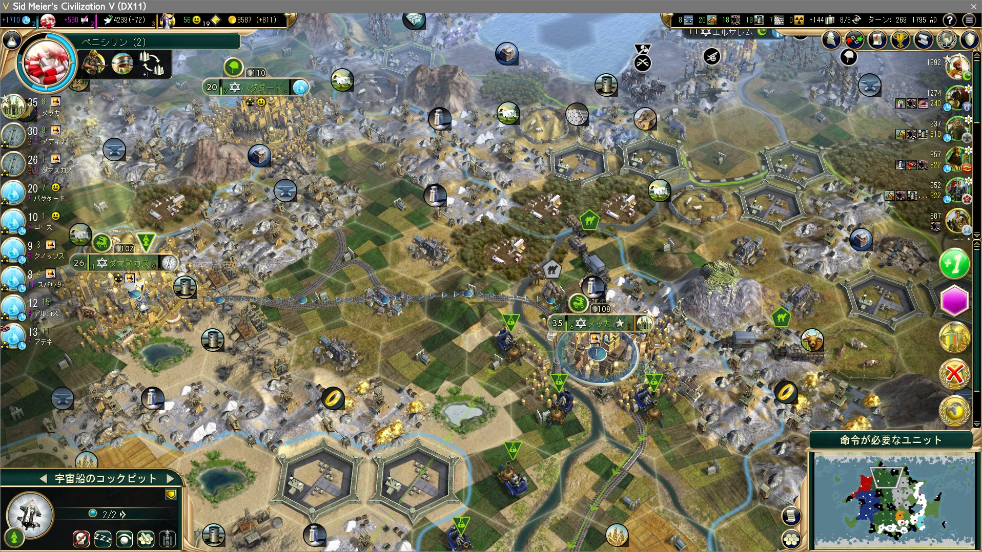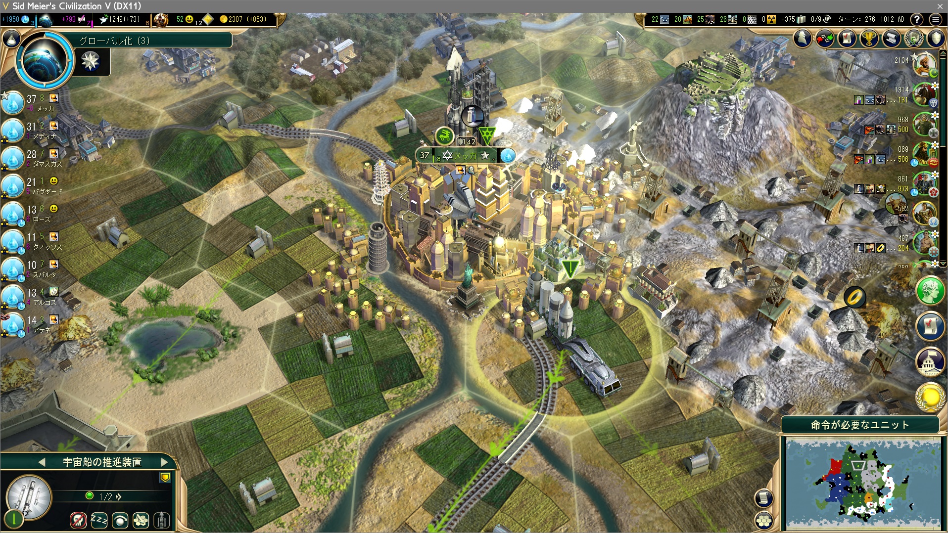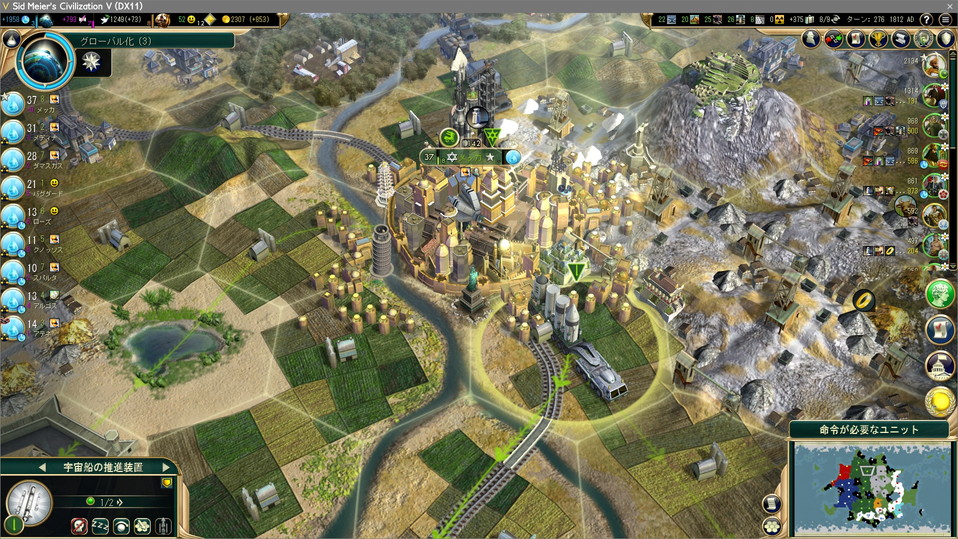 軍事都市はその役割を終え、宇宙船のパーツ生産にシフト。宇宙船のパーツ生産のための都市は生産力一位or二位の都市をチョイスすればいい。