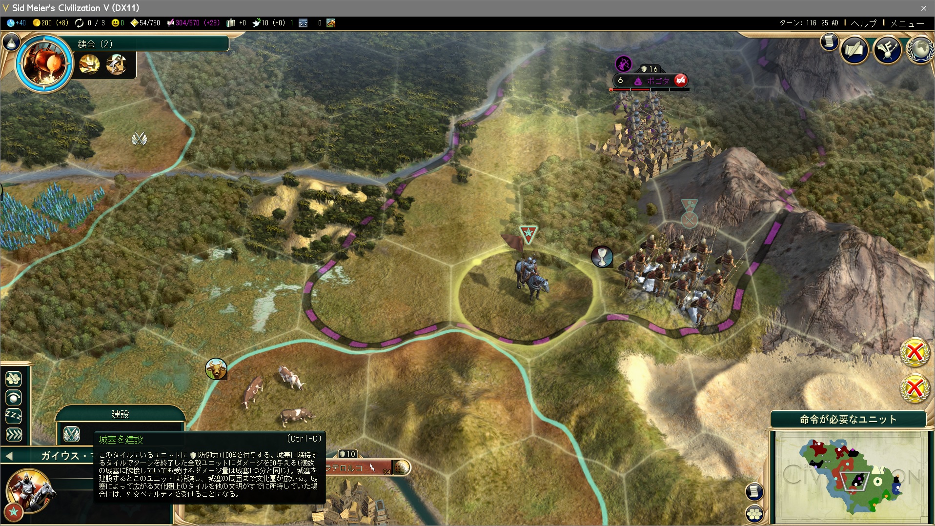 城塞どーん!なお、都市国家の視界外なので攻撃されないもよう。城塞右上の森林がないか、城塞タイルが丘陵上なら視界に収まるのだが。