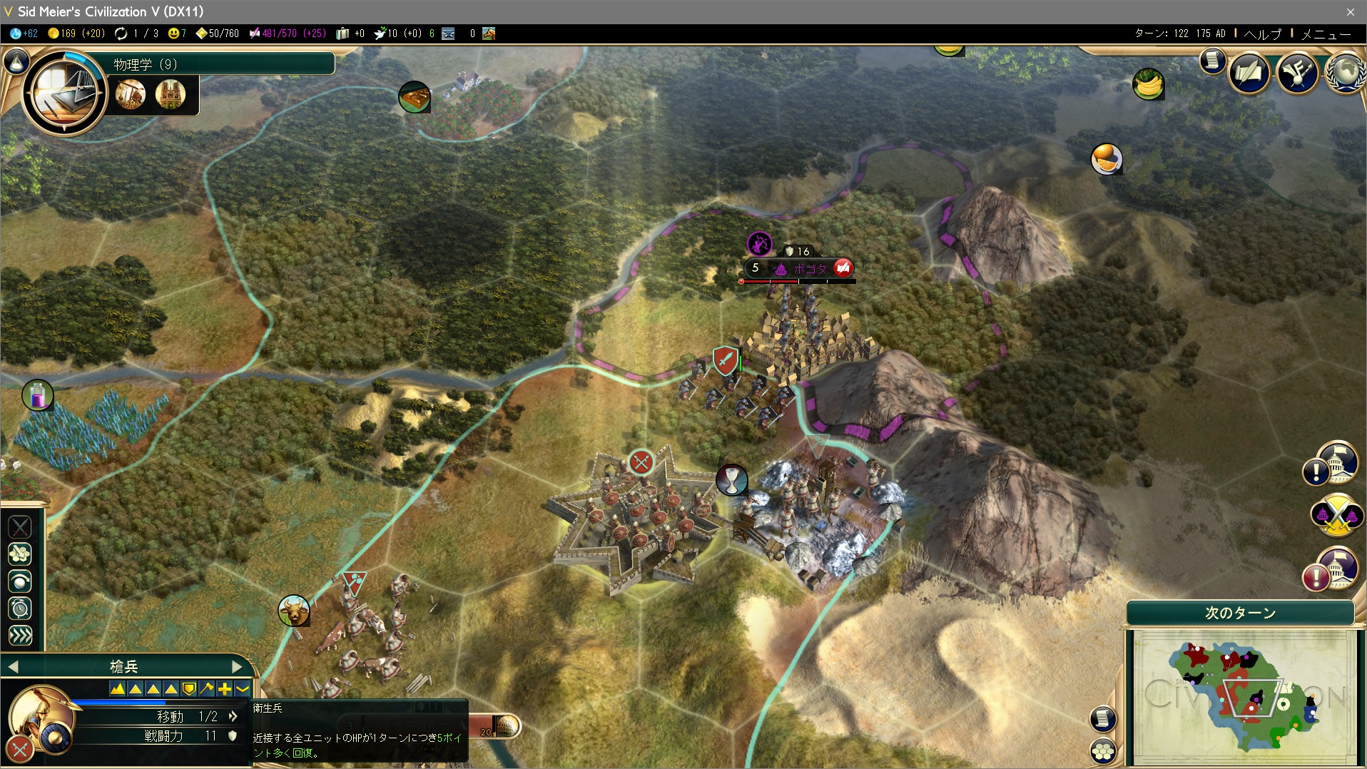 しょうがないので森林タイルで攻撃を受ける。昇進:衛生兵もちのユニットを隣接させ回復力を補っているぞ。基本値(10)+自文化圏(10)+衛生兵(5)=25以内のダメージなら毎ターンHP100まで回復するので放置できるわけだ。