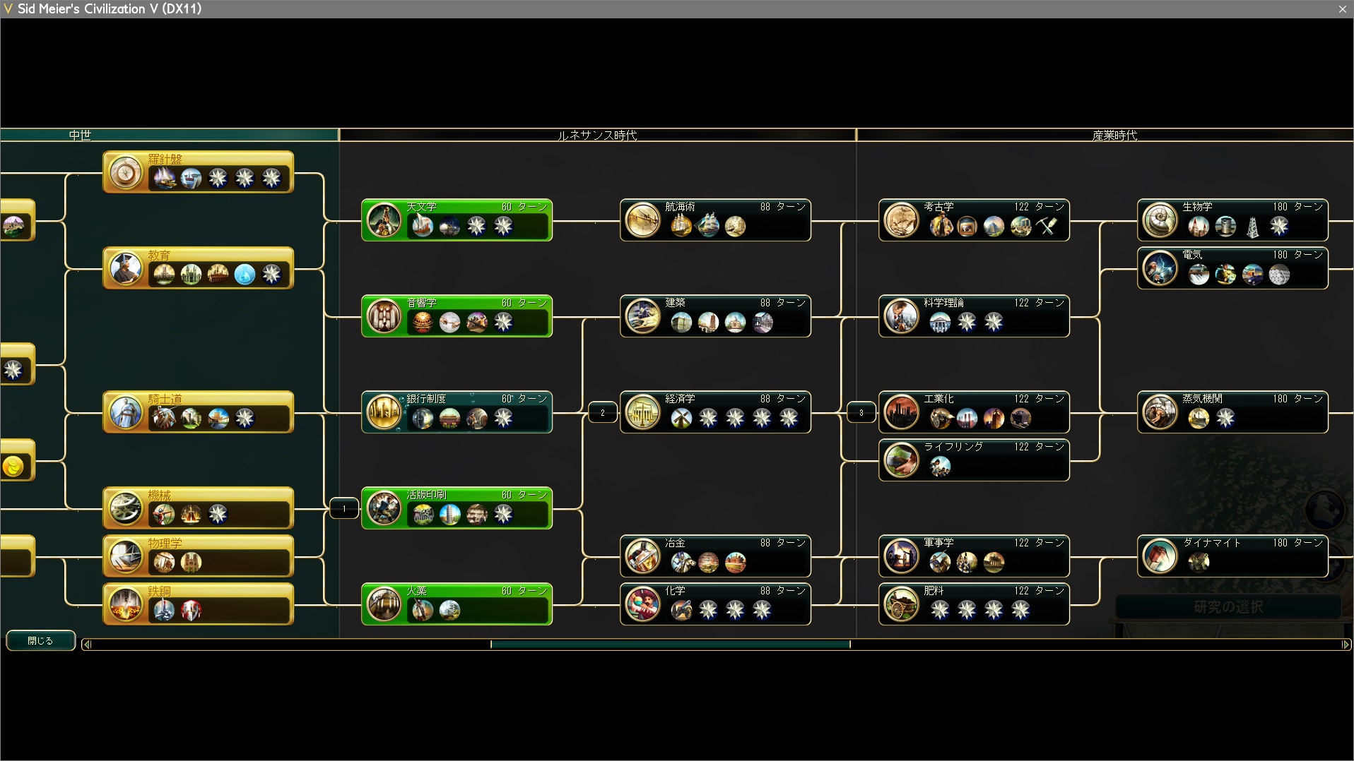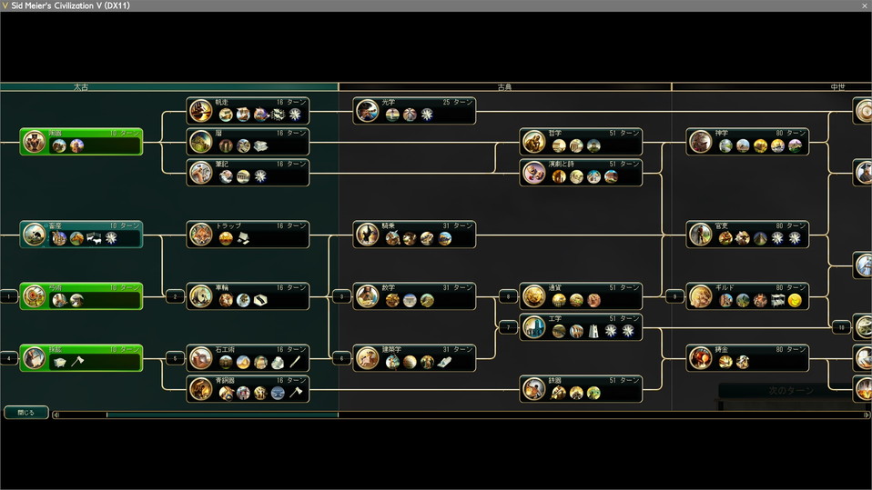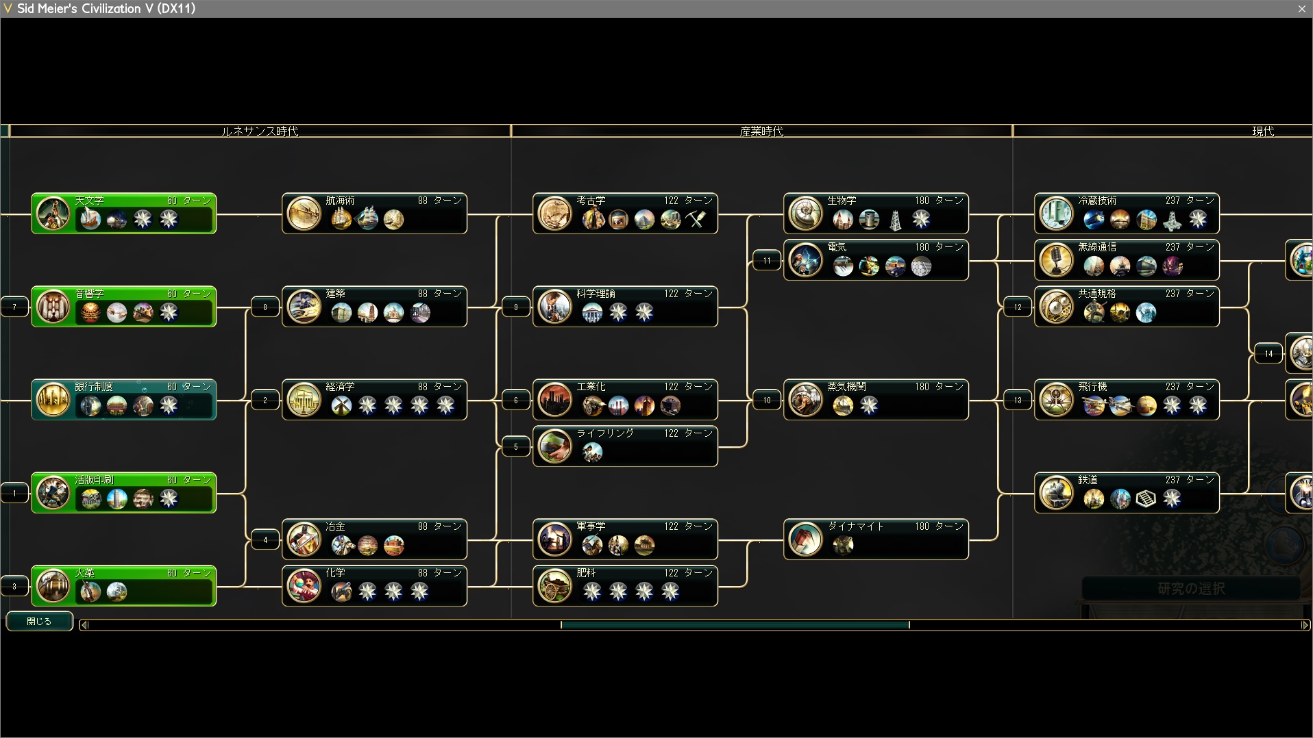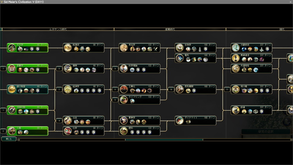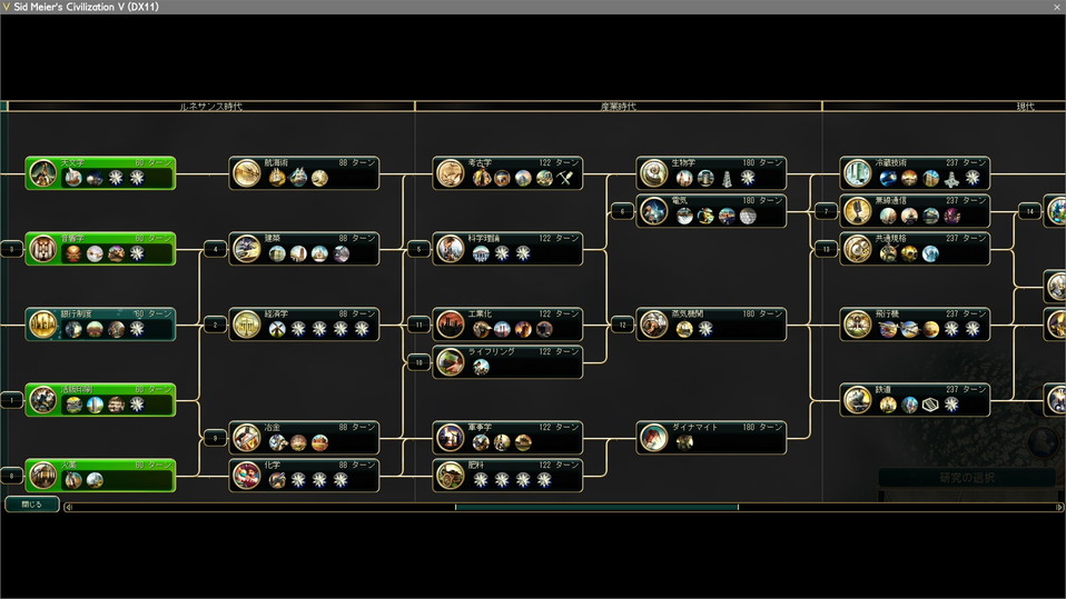 科学勝利最短ルートだが、文化勝利に必須のホテルを解禁する冷蔵技術をスルーしている。が、空港がホテルとおんなじ能力なので問題ないだろう。