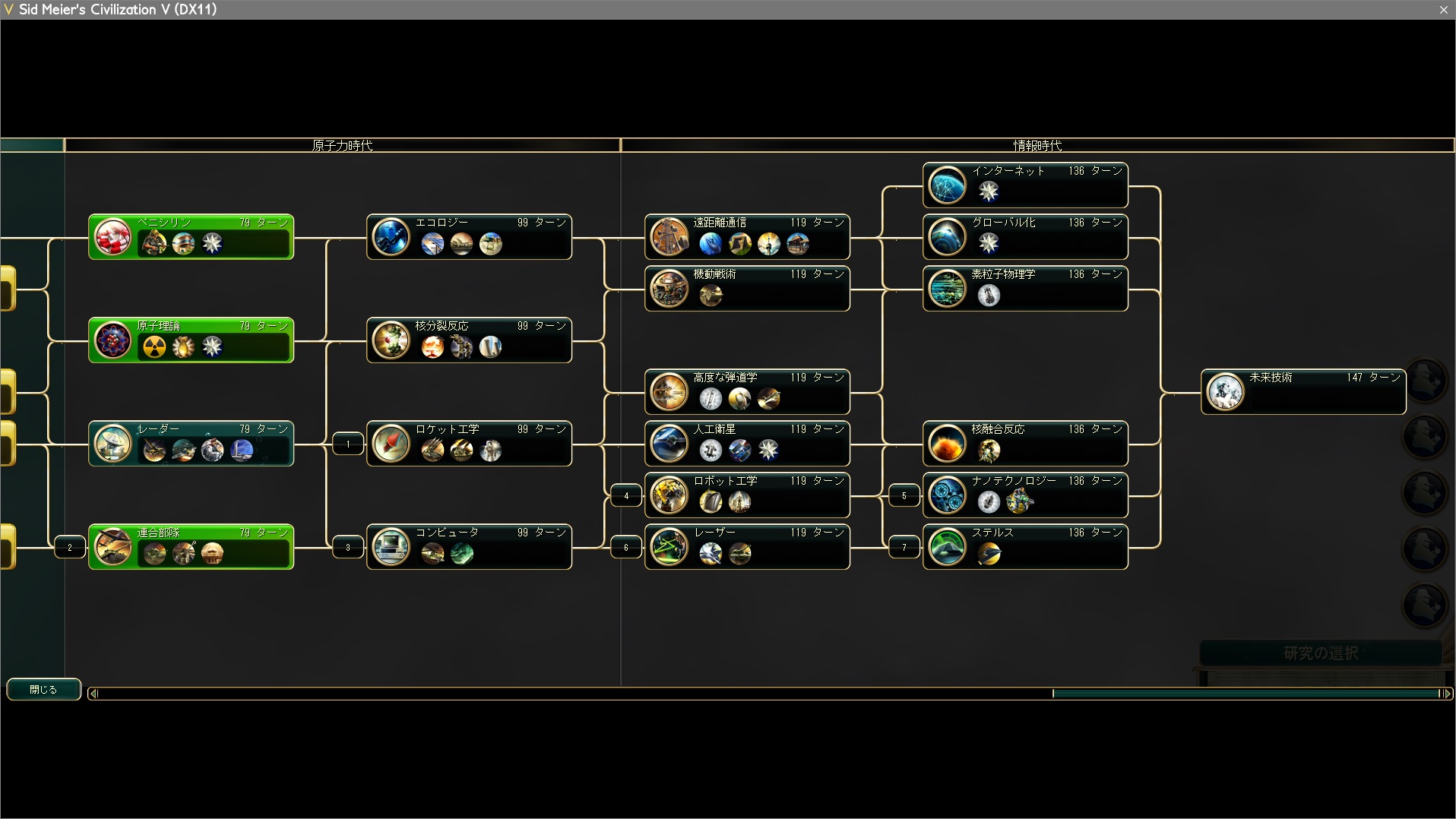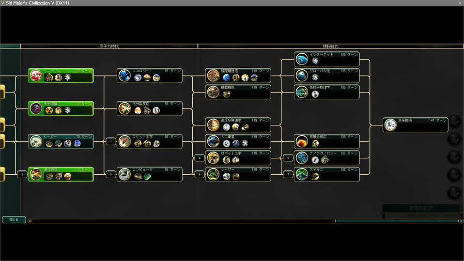 原子力時代スタートでナノテクノロジー&ステルスをクリック。7番目にナノテクノロジー&ステルス。必要ビーカーが莫大だが、これ以上テクノロジーはいらないので大科学者もOXも使い切ろう。