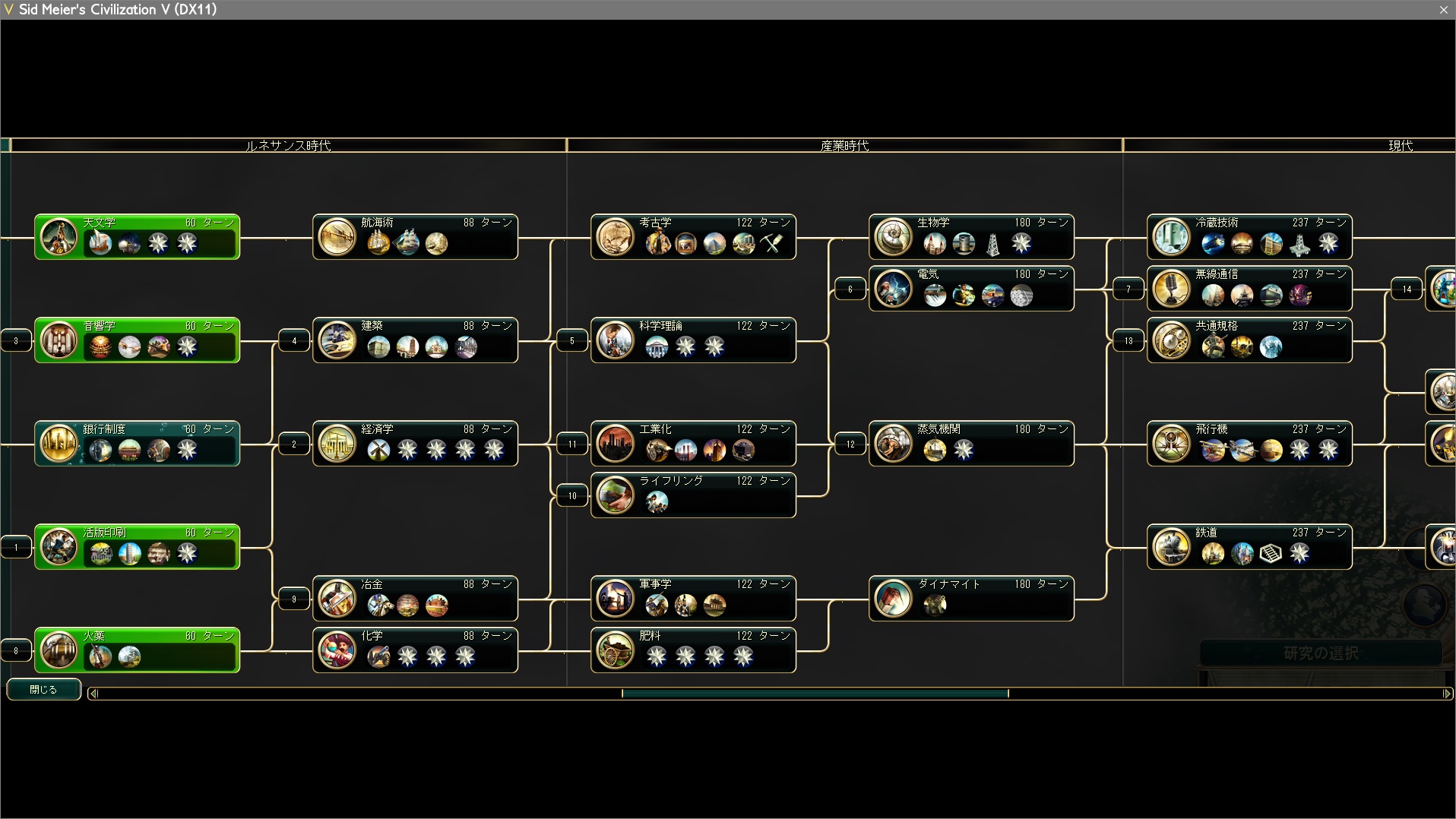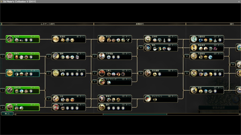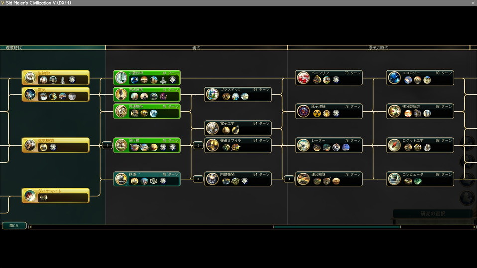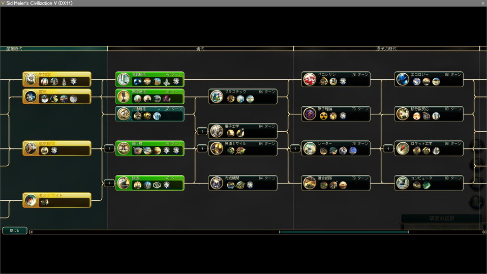 ルネサンススタートで電子工学をクリック。14番目に電子工学。好戦的なAI文明であっても現代の下ルート(内燃機関・連合部隊)はスルーしがちなので、戦艦の解禁は早め。現代ラッシュは敵の戦艦が出て来るまでに決着をつけたい。