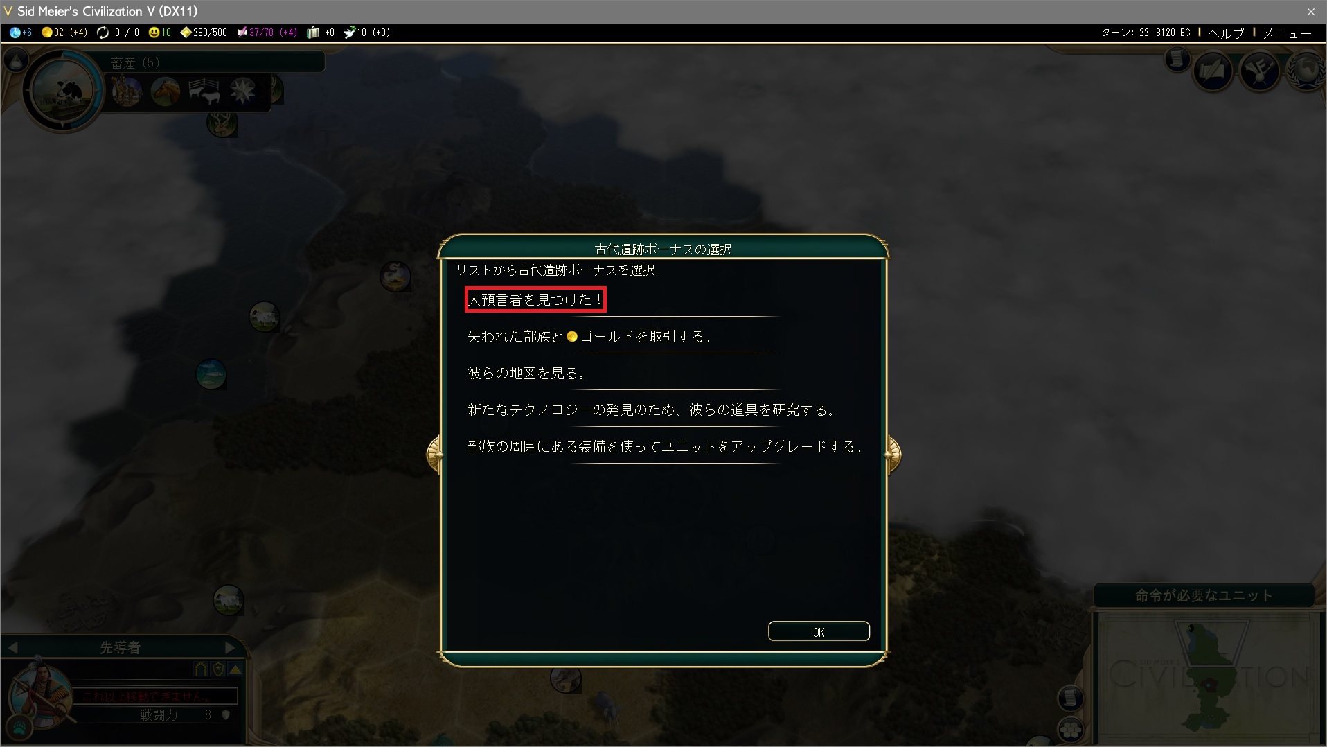 先導者の古代遺跡ボーナスの選択「大預言者を見つけた!」 |