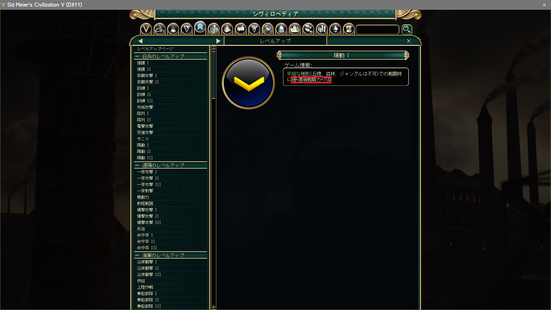 [ICON_RANGE_STRENGTH]遠隔戦闘力+15%。 Row Tag="TXT_KEY_PROMOTION_SHOCK_1_HELP" Row Tag="TXT_KEY_PROMOTION_SHOCK_2_HELP" Row Tag="TXT_KEY_PROMOTION_SHOCK_3_HELP" ※SHOCK = 陽動 |
