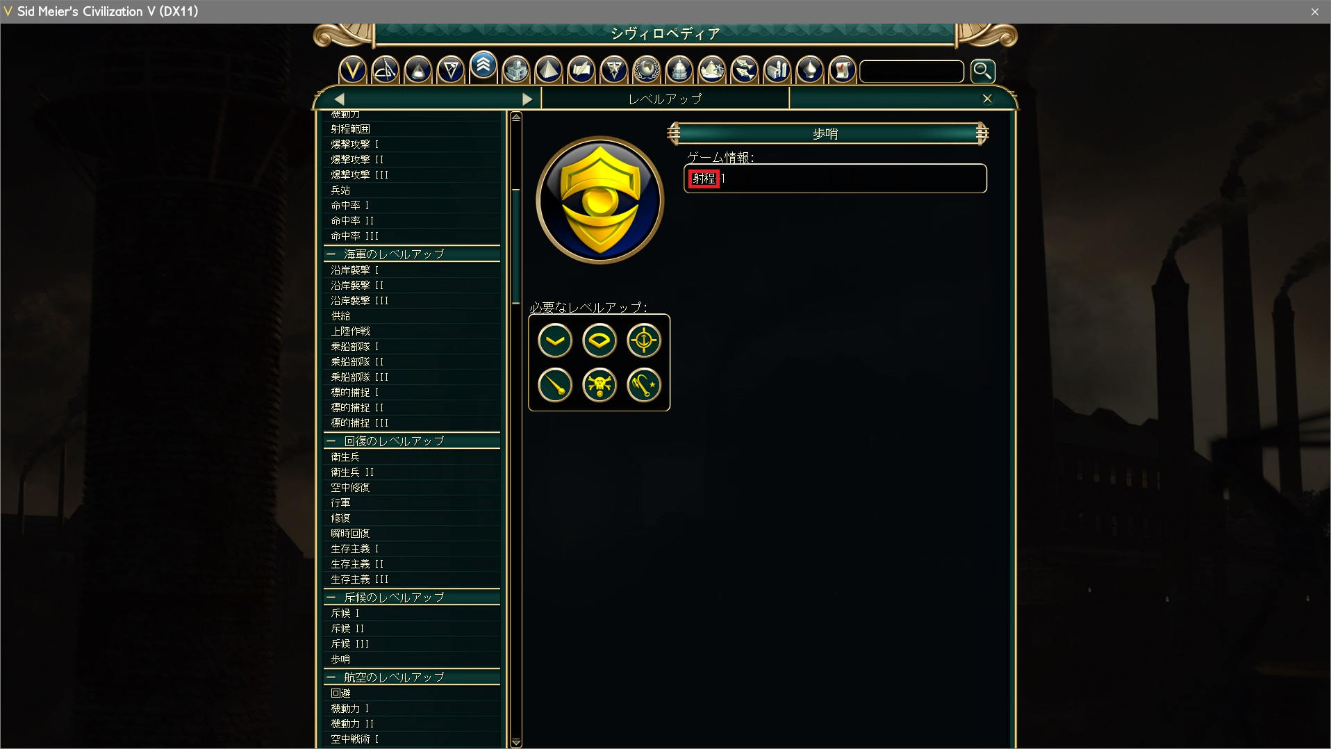 射程+1 Row Tag="TXT_KEY_PROMOTION_SENTRY_HELP" ※SENTRY = 歩哨 |