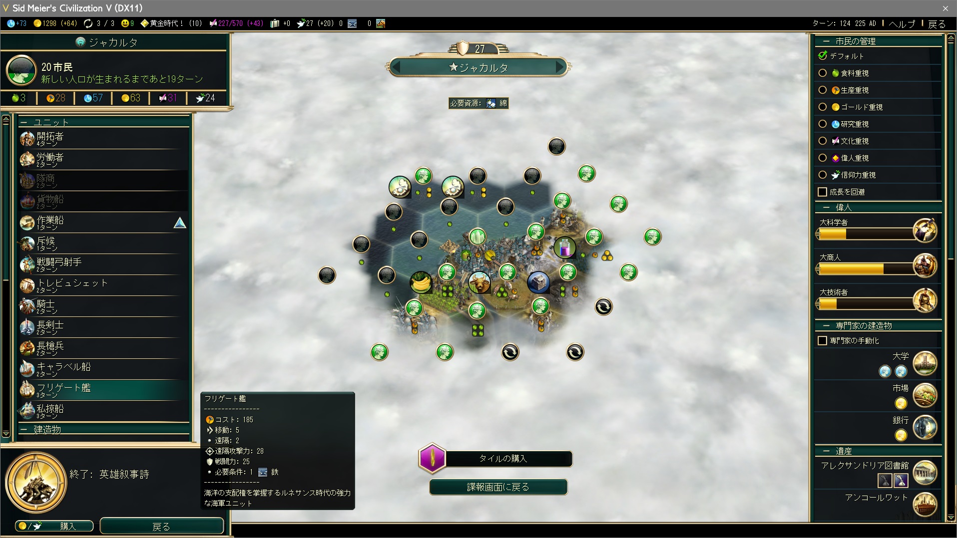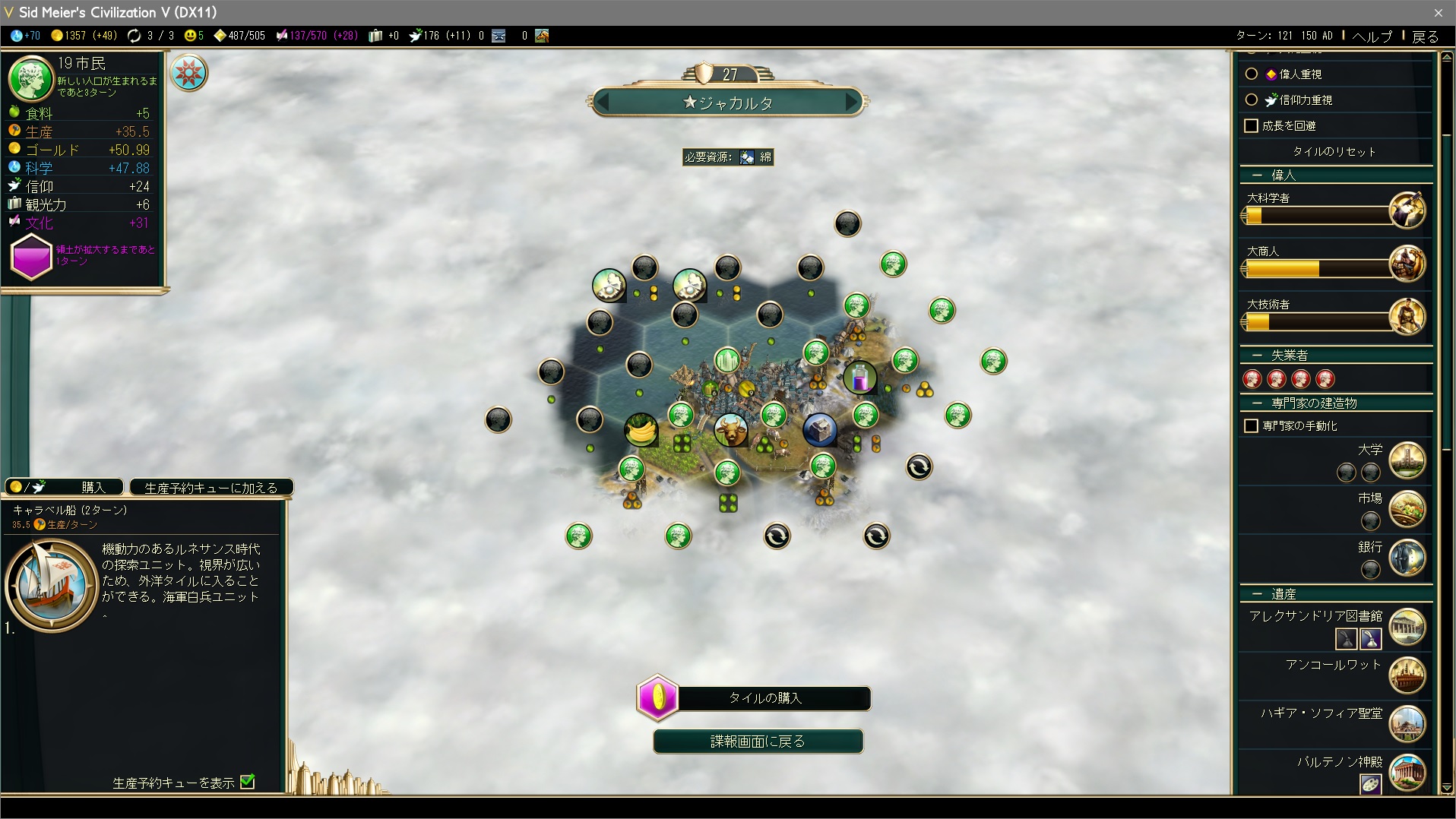 上の画面を見てほしい。実際のプレイでは画像左上の香辛料の右タイルに都市を建てられ、都市アガイディカと2つの日本の都市が隣接してしまった。今回は創造主に勝つプレイレポではないので、日本の開拓者を妨害して都市建設を阻止した。