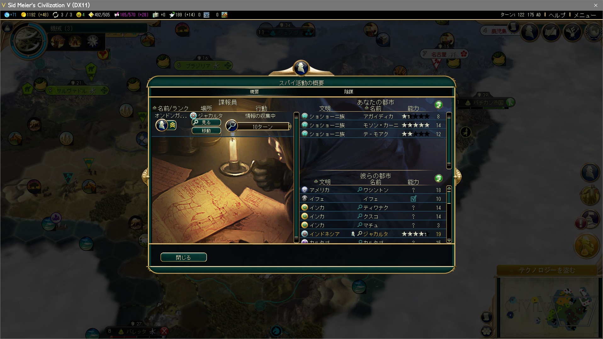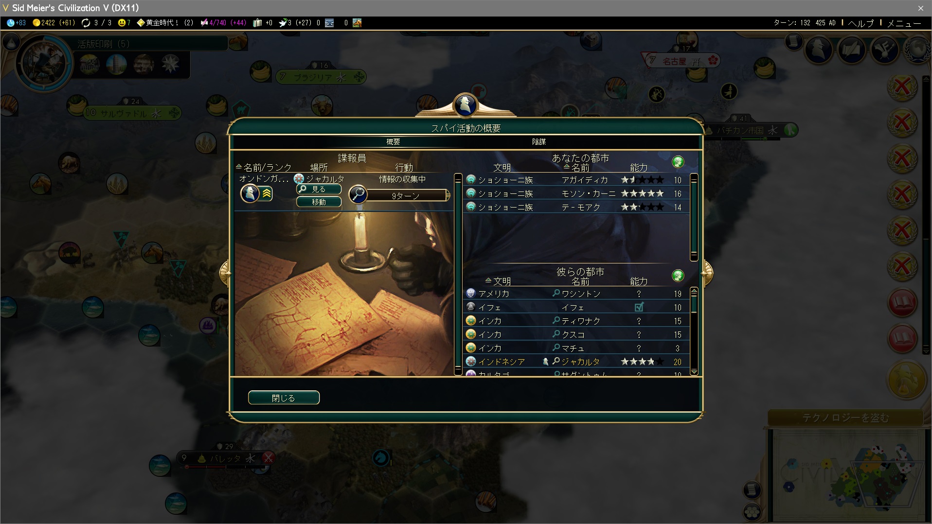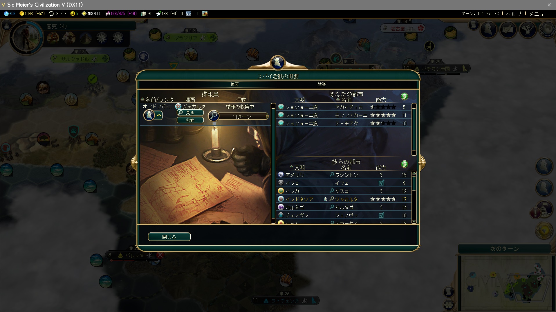 ゲーム設定はパンゲア普通8文明、AIはインドネシア・アメリカ・シャム・カルタゴ・インカ・ブラジル・日本だ。今回はインドネシアにスパイを潜入させる。