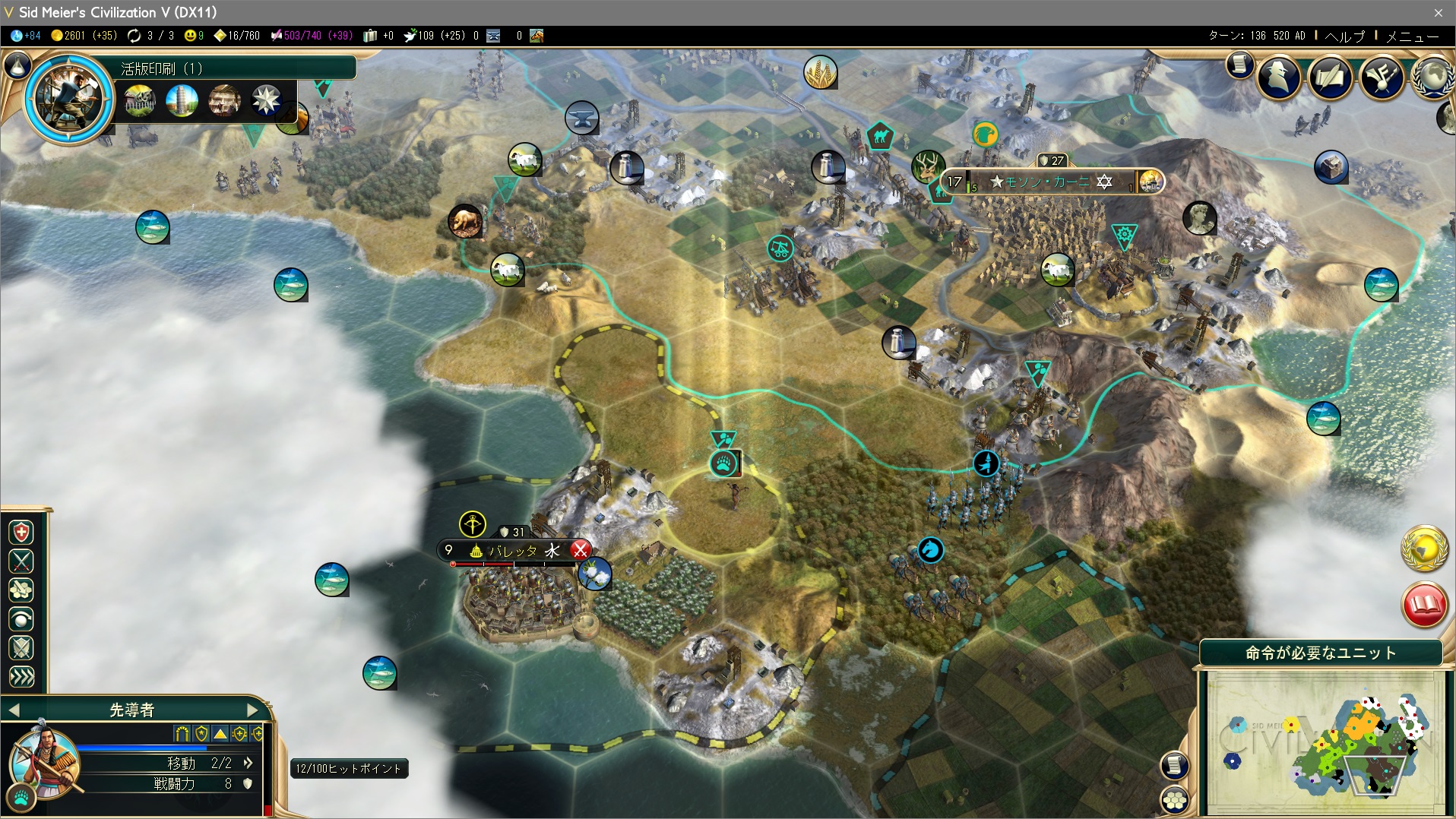 ターン122、テクノロジー奪取まであと10ターン。研究は、機械→活版印刷(途中まで)。